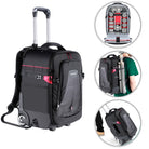- El tamaño grande admite una gran cantidad de equipos fotográficos y ruedas con calidad de patines para garantizar una movilidad sin esfuerzo, ya sea a través de terminales de aeropuerto, a través de terrenos irregulares o sesiones fotográficas remotas.