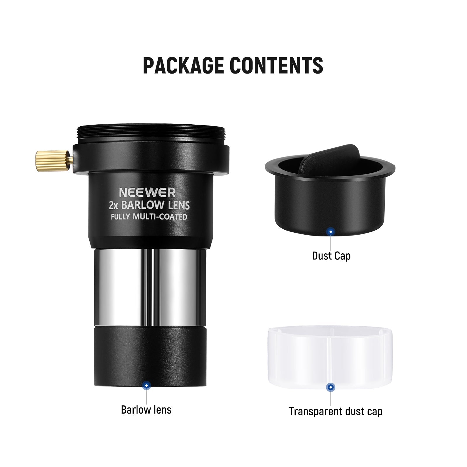 - Aumento 2x con una interfaz de 1,25": la lente Barlow 2X de NEEWER duplica el aumento de cualquier ocular de 1,25". Es fácil de usar; inserte el ocular en la lente Barlow y luego inserte la lente Barlow en el visor.