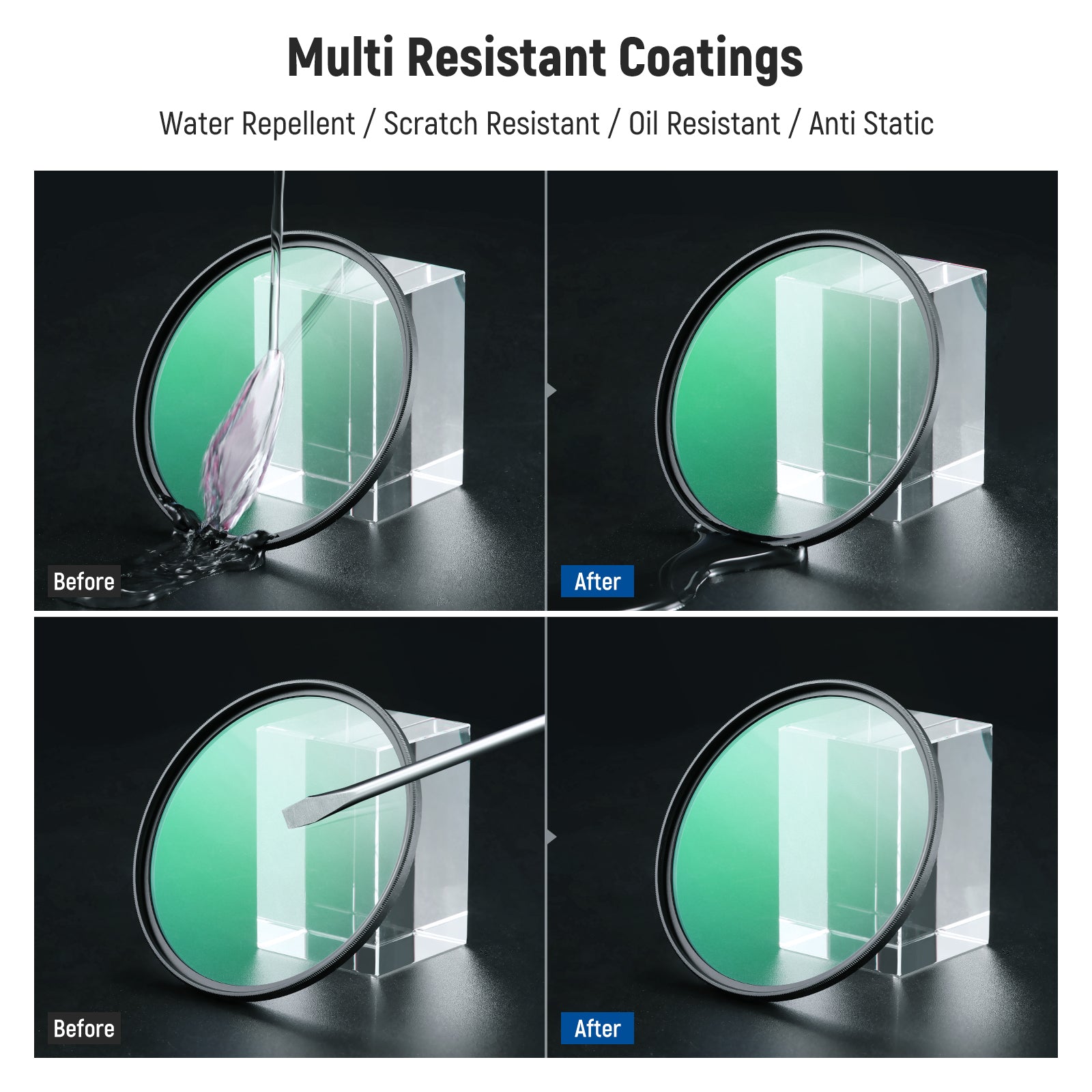 - Múltiples nano recubrimientos : múltiples nano recubrimientos en ambos lados son repelentes al agua, resistentes a rayones y oleofóbicos, lo que reduce eficazmente el reflejo proveniente del filtro mismo y del suelo.