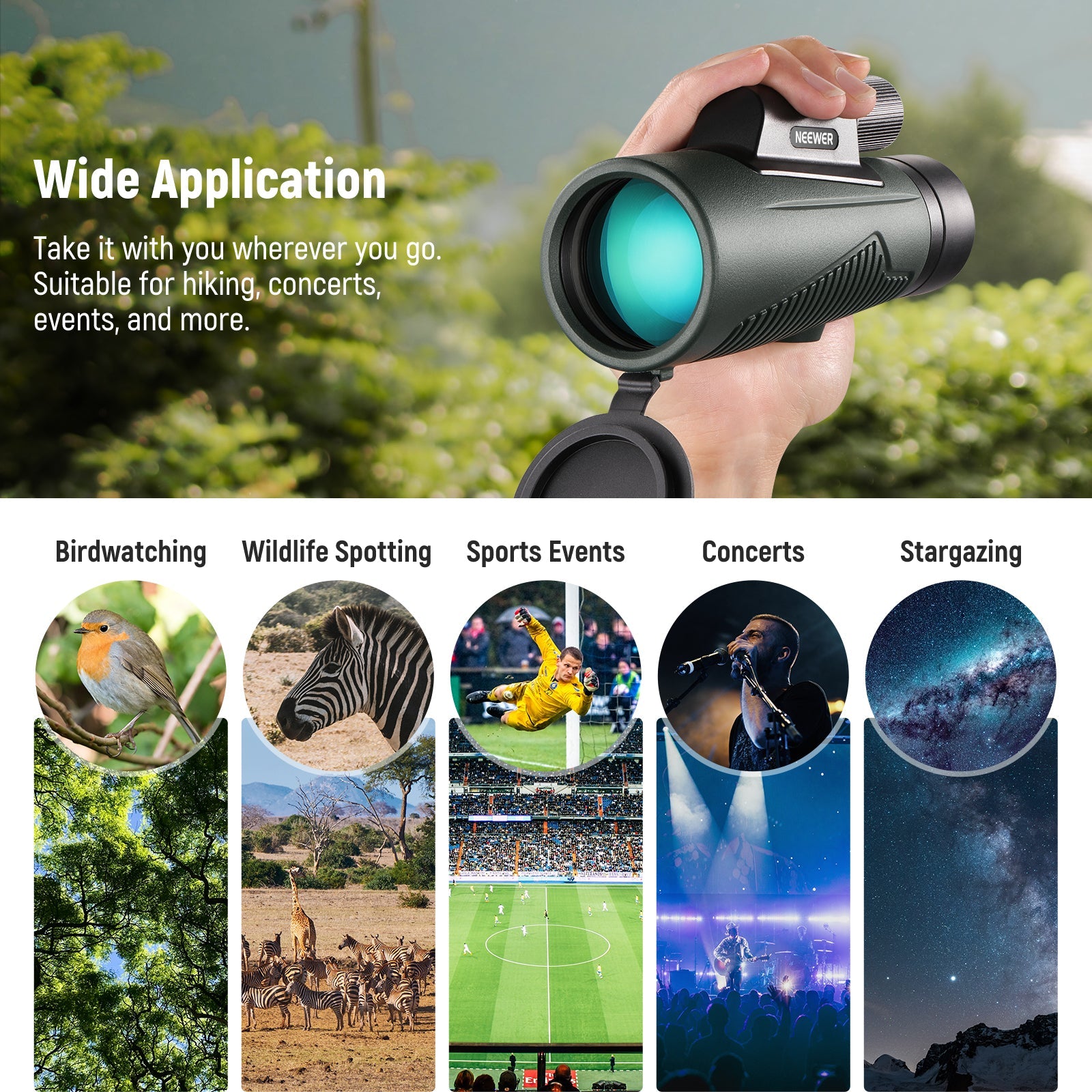 - Diseñado para una amplia aplicación : obtenga una vista clara para la observación de aves, observación de vida silvestre, fotografía de paisajes, eventos deportivos, observación astronómica, observación de estrellas, conciertos, caminatas, caza, visitas turísticas, campamentos y otras actividades. Se incluye un estuche de transporte para almacenamiento y transporte seguros.