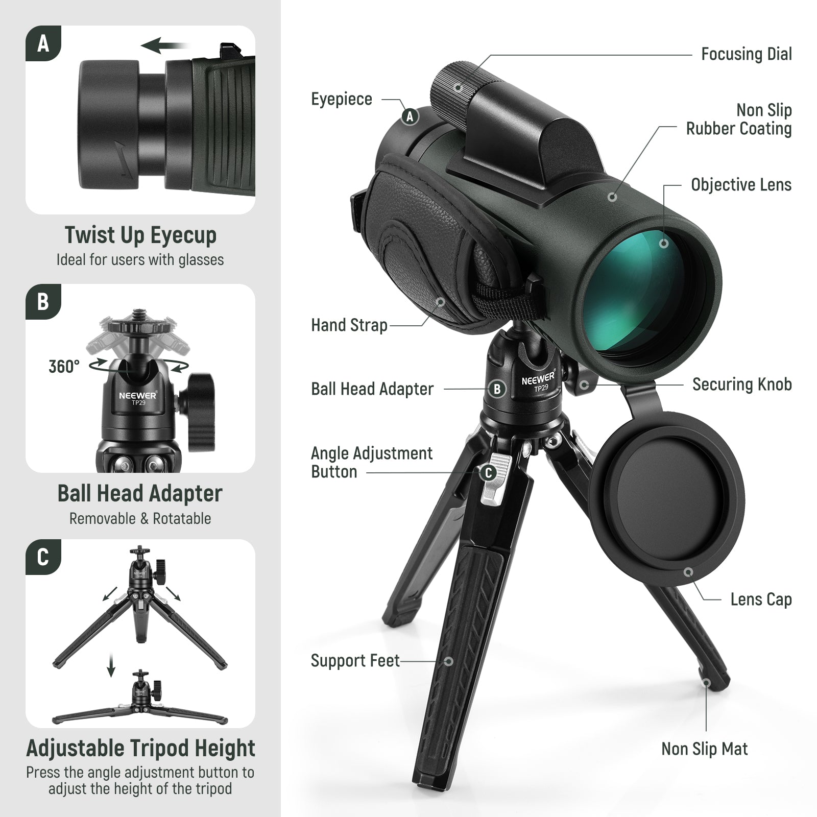 - Construcción impermeable IPX7 : la armadura llena de nitrógeno es resistente al agua, a los golpes y a la niebla IP7X para soportar condiciones climáticas adversas al aire libre. El cómodo mango permite un fácil manejo manual y las ranuras evitan que el monocular se resbale de la mano