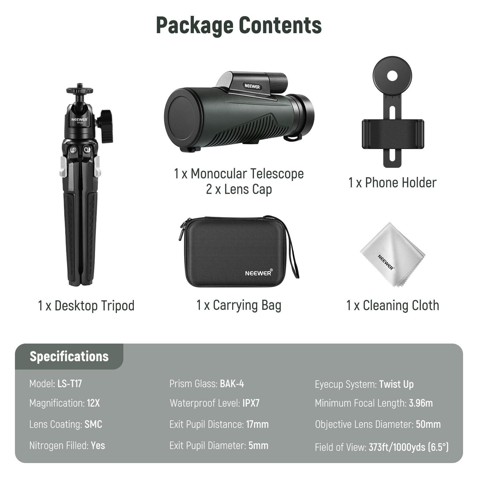 - Monocular premium 12X50 ED : aumento de 12x, un objetivo de 50 mm que capta la luz y un ocular de 18 mm pueden brindarle imágenes brillantes y nítidas desde hasta 373 pies/1000 yardas. El prisma BAK-4 y la lente SMC garantizan una alta transmisión de luz y una reproducción fiel del color. Un ocular giratorio es ideal para usuarios con gafas.