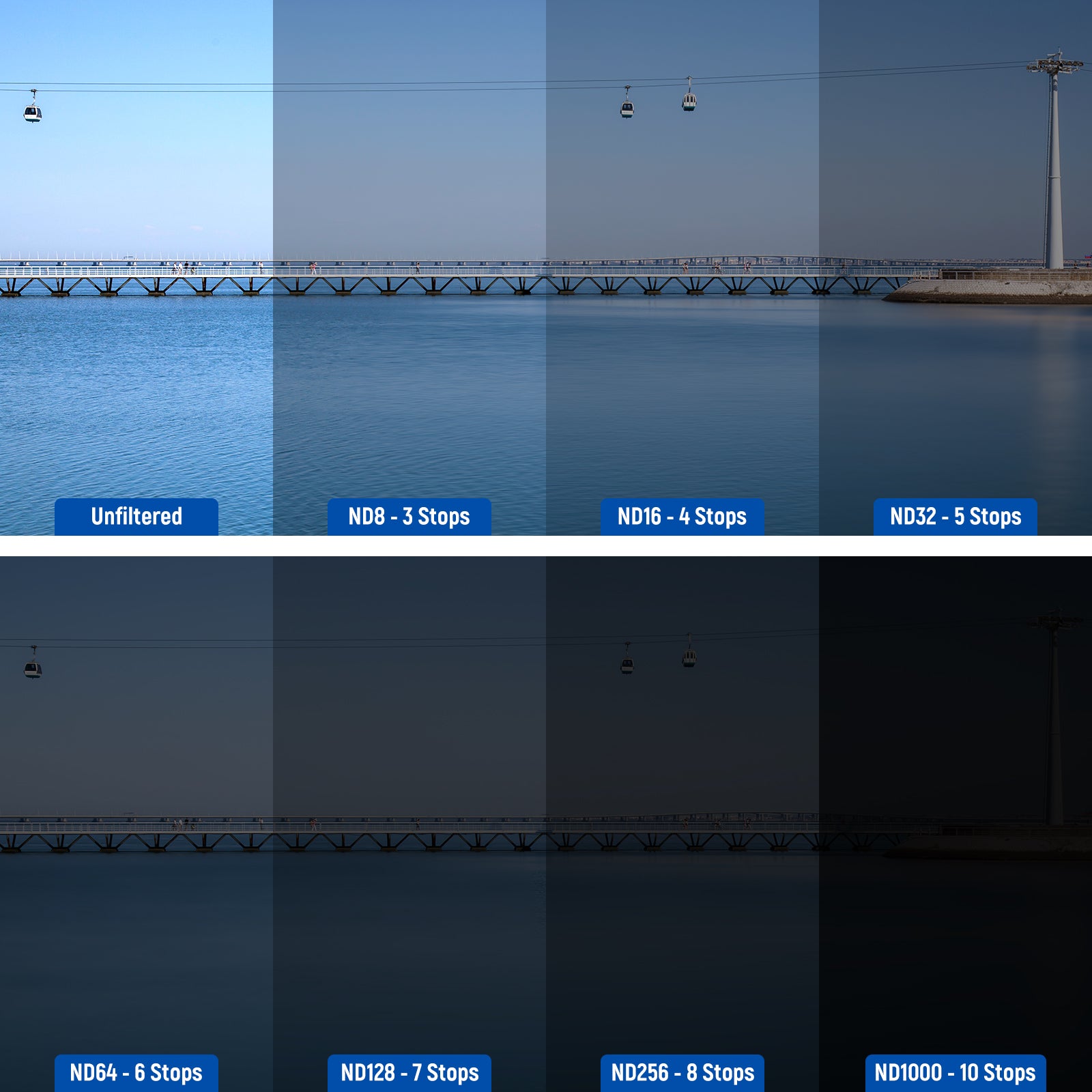 - Controle la exposición y reduzca los reflejos : los filtros ND/PL ofrecen una solución práctica al combinar las funciones de los filtros de densidad neutra (ND) y polarizador (PL) en una sola unidad. ND8/PL, ND16/PL, ND32/PL y ND64/PL reducen la luz en 3, 4, 5 y 6 pasos respectivamente, lo que permite un control preciso de la exposición en diferentes condiciones de iluminación. Los filtros ND/PL evitan la sobreexposición, minimizan el deslumbramiento y los reflejos de superficies no metálicas como el agua y el vidrio.