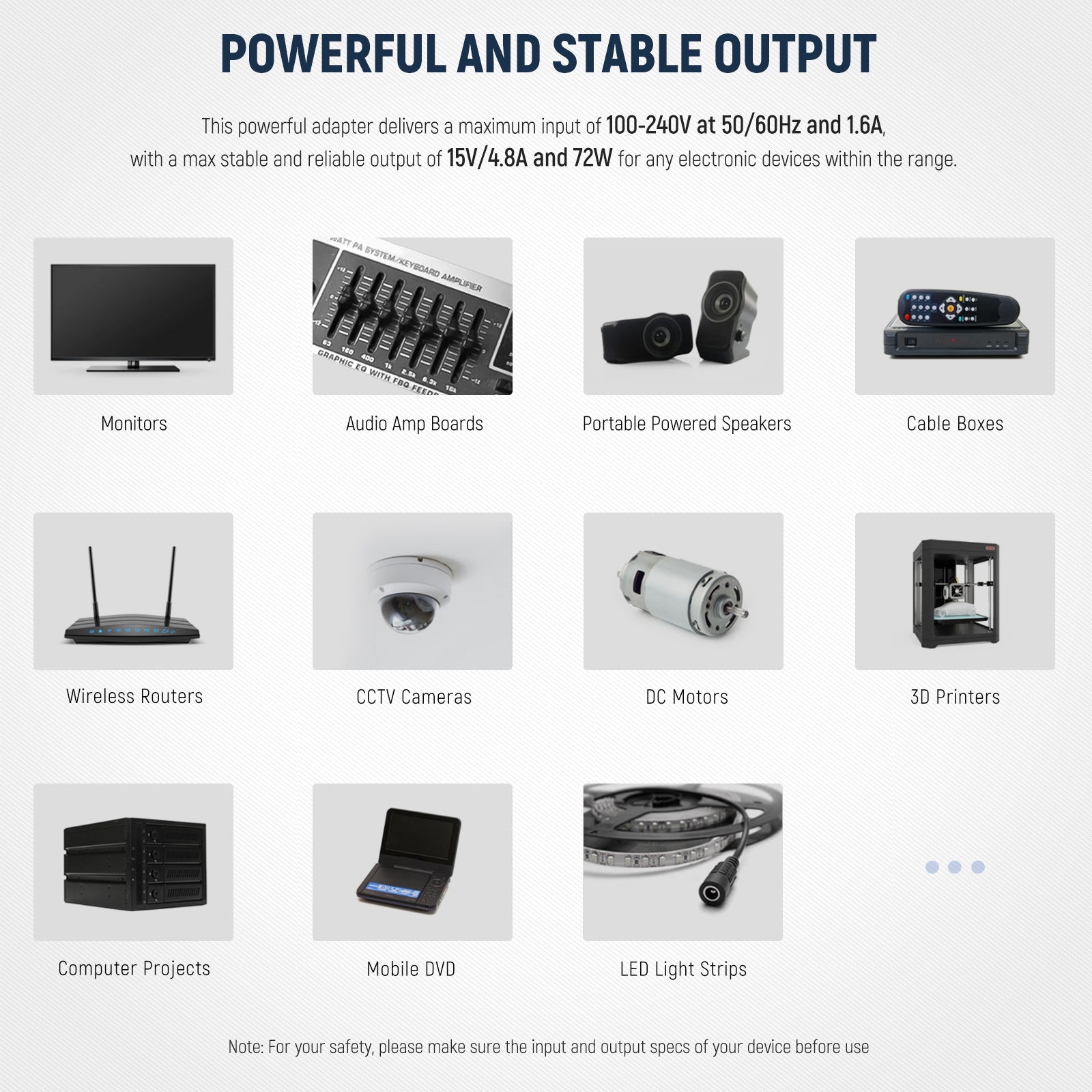 - Salida de 15 V/4,8 A 72 W : este potente adaptador y cable ofrecen una entrada máxima de 100-240 V a 50/60 Hz y 1,6 A, con una salida máxima estable y confiable de 15 V/4,8 A y 72 W para cualquier dispositivo electrónico dentro del rango. Nota: Para su seguridad, asegúrese de que las especificaciones de entrada y salida de su dispositivo antes de usarlo