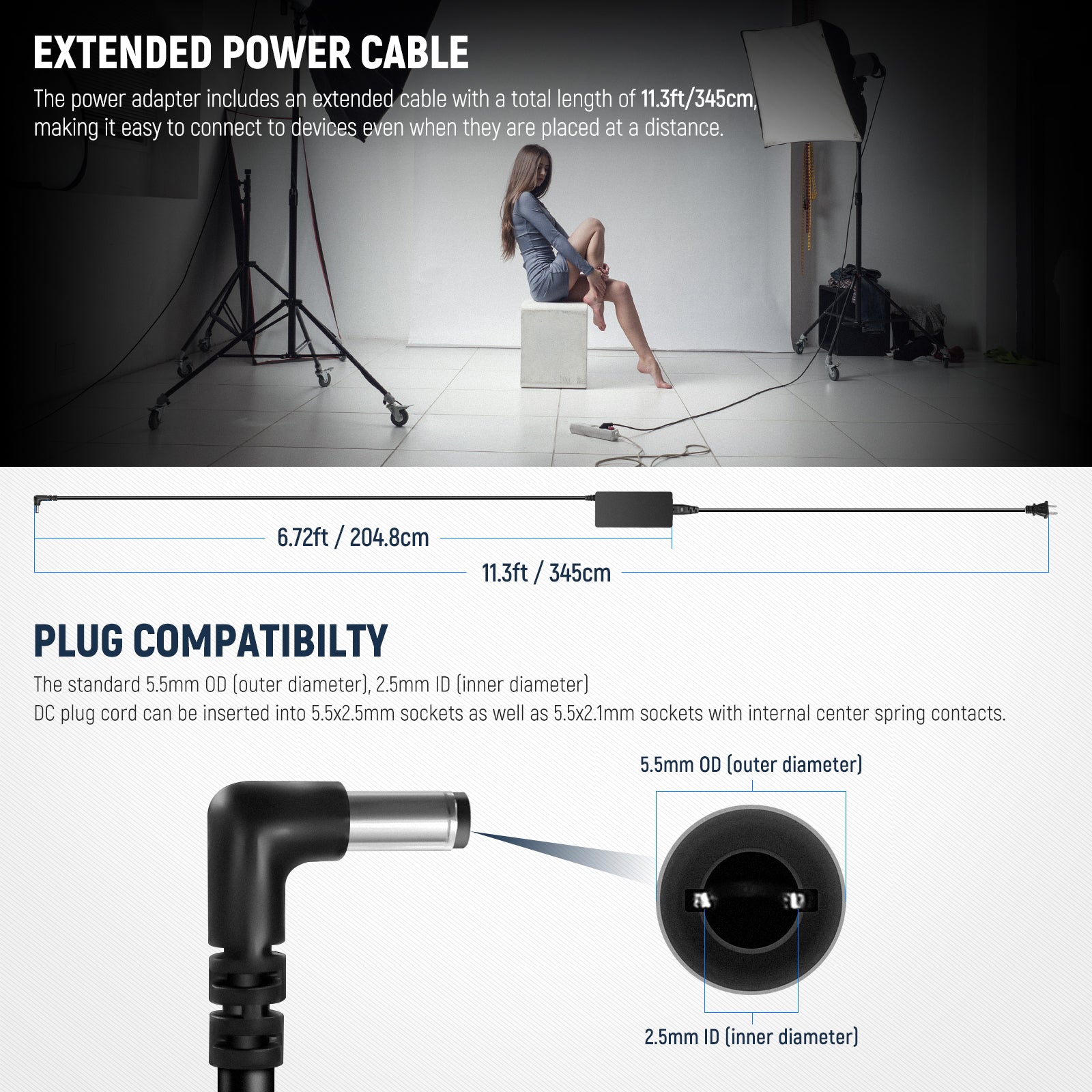 - Compatibilidad ampliada con cables y enchufes : el adaptador de corriente y el cable vienen con una longitud total de cable de 11,3 pies/345 cm, lo que facilita la conexión a dispositivos incluso cuando están colocados a distancia. Además, el cable de enchufe de CC estándar de 5,5 mm de diámetro exterior (diámetro exterior) e ID de 2,5 mm (diámetro interior) se puede insertar en enchufes de 5,5 x 2,5 mm, así como en enchufes de 5,5 x 2,1 mm con contactos de resorte centrales internos.