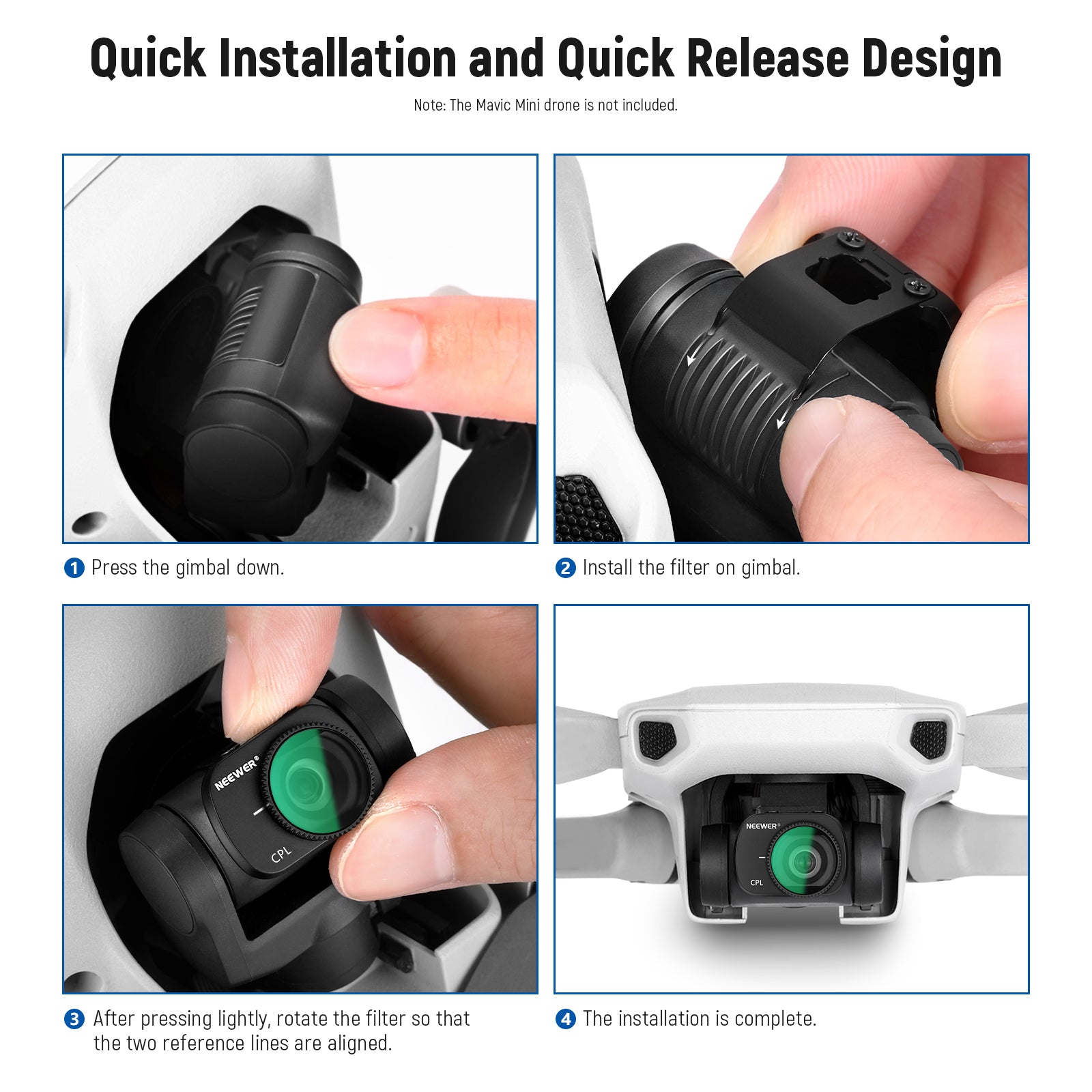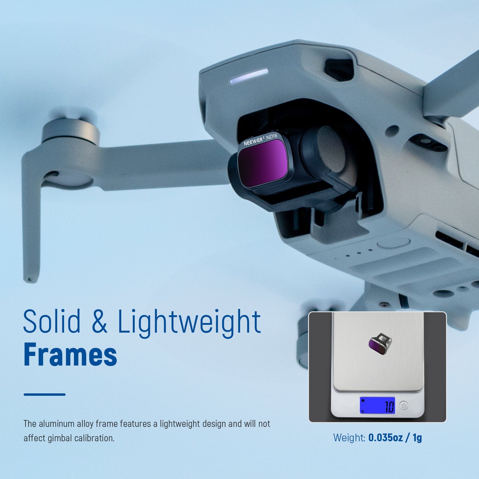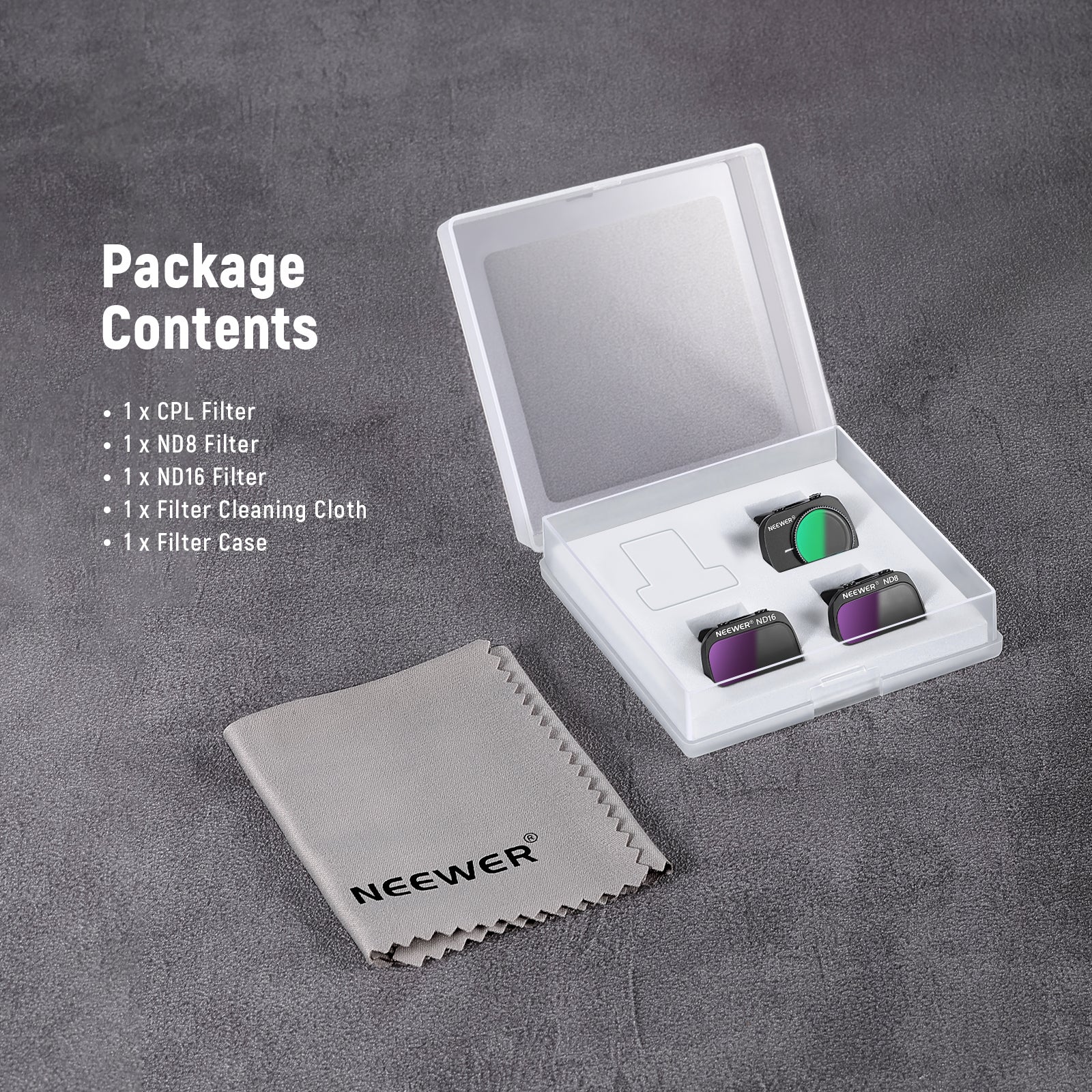 - Compatible con Mavic Mini/Mini 2/Mini SE- NEEWER Paquete de 3 filtros de lente ND8+ND16+CPL está diseñado específicamente para la cámara DJI Mavic Mini/Mavic Mini 2/Mini SE. Lleve este kit a donde quiera que vaya en el práctico estuche de viaje provisto. El paquete también incluye 3 filtros y un paño de limpieza de filtros.