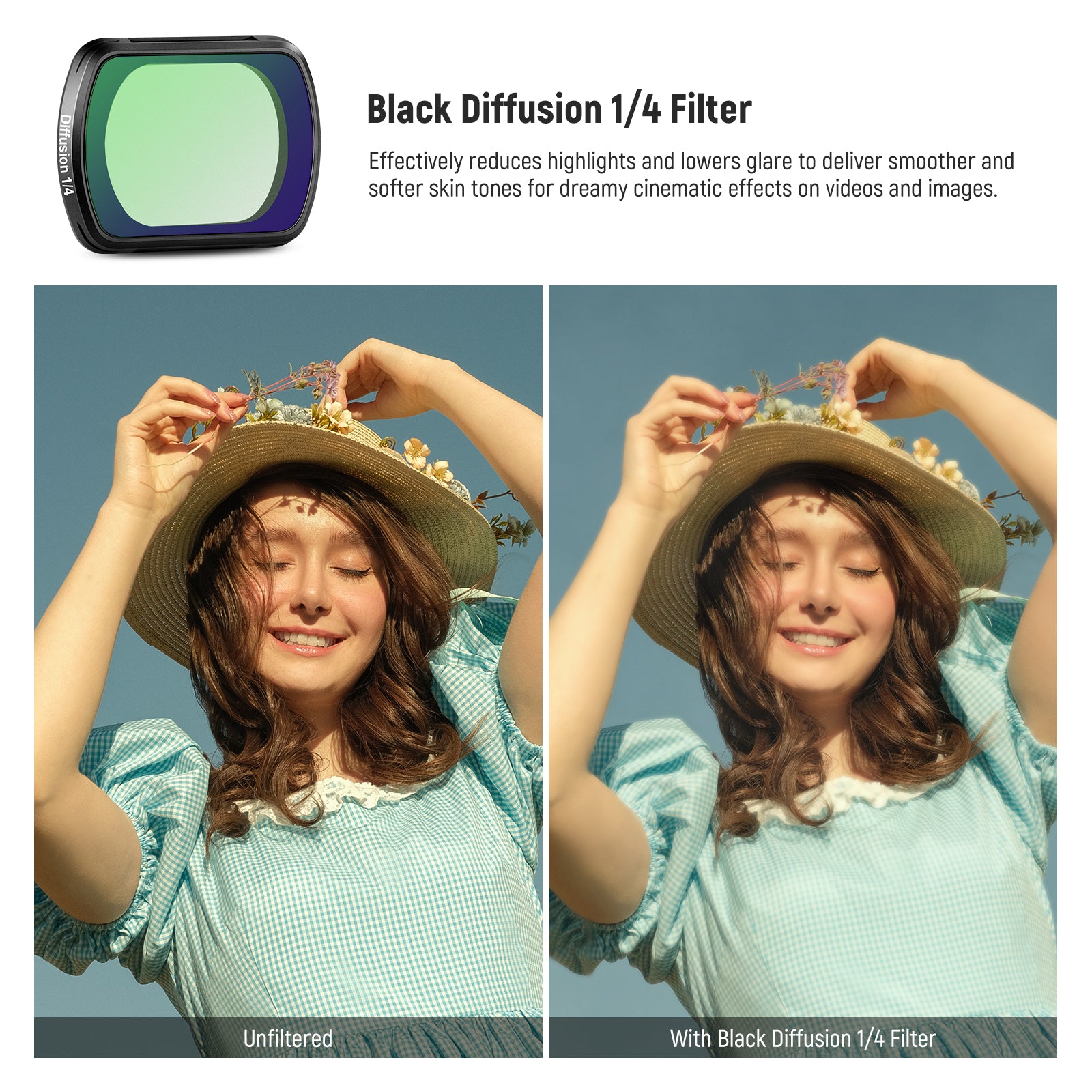 - Ambiente cinematográfico de ensueño y grabaciones nocturnas impactantes : el filtro de difusión negro de 1/4" con efecto cinematográfico de ensueño reduce las altas luces y el deslumbramiento para una apariencia más borrosa y suave, ideal para retratos, videos y vlogs. El filtro de reducción de contaminación lumínica reduce el color amarillo/verde causado por las luces de la ciudad, captura detalles del sujeto, mantiene el contraste adecuado y evita la sobreexposición.