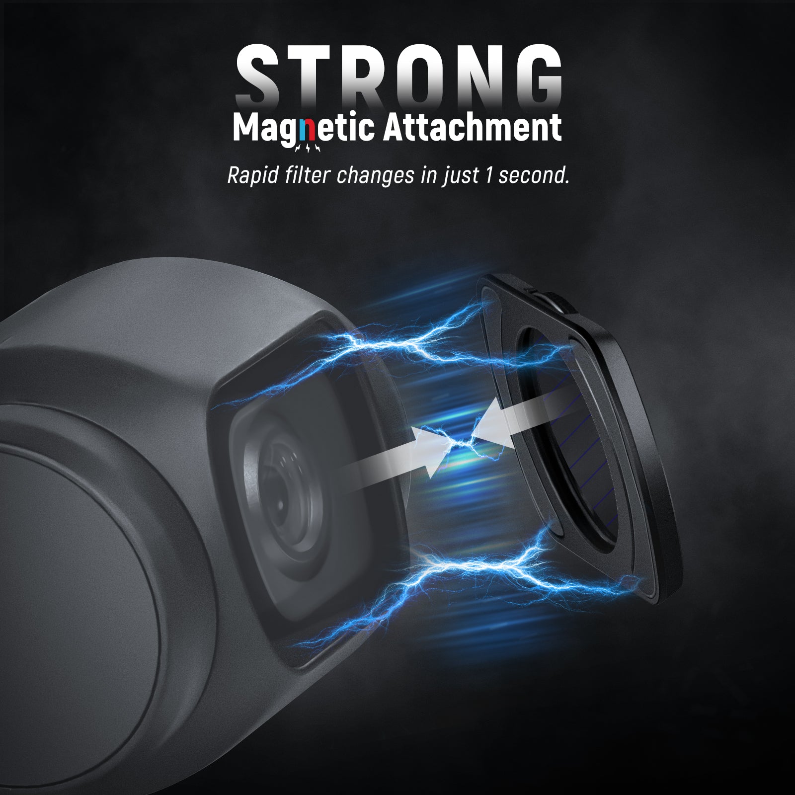 - Fijación magnética rápida y segura : El diseño magnético garantiza cambios de filtro rápidos en tan solo 1 segundo y proporciona un agarre seguro al usar el seguimiento automático, fotografiar deportes al aire libre o alternar entre disparos horizontales y verticales. El marco ligero de aluminio mecanizado con precisión CNC (1,62 g cada uno) se ajusta perfectamente al estabilizador sin afectar su calibración ni almacenamiento.
