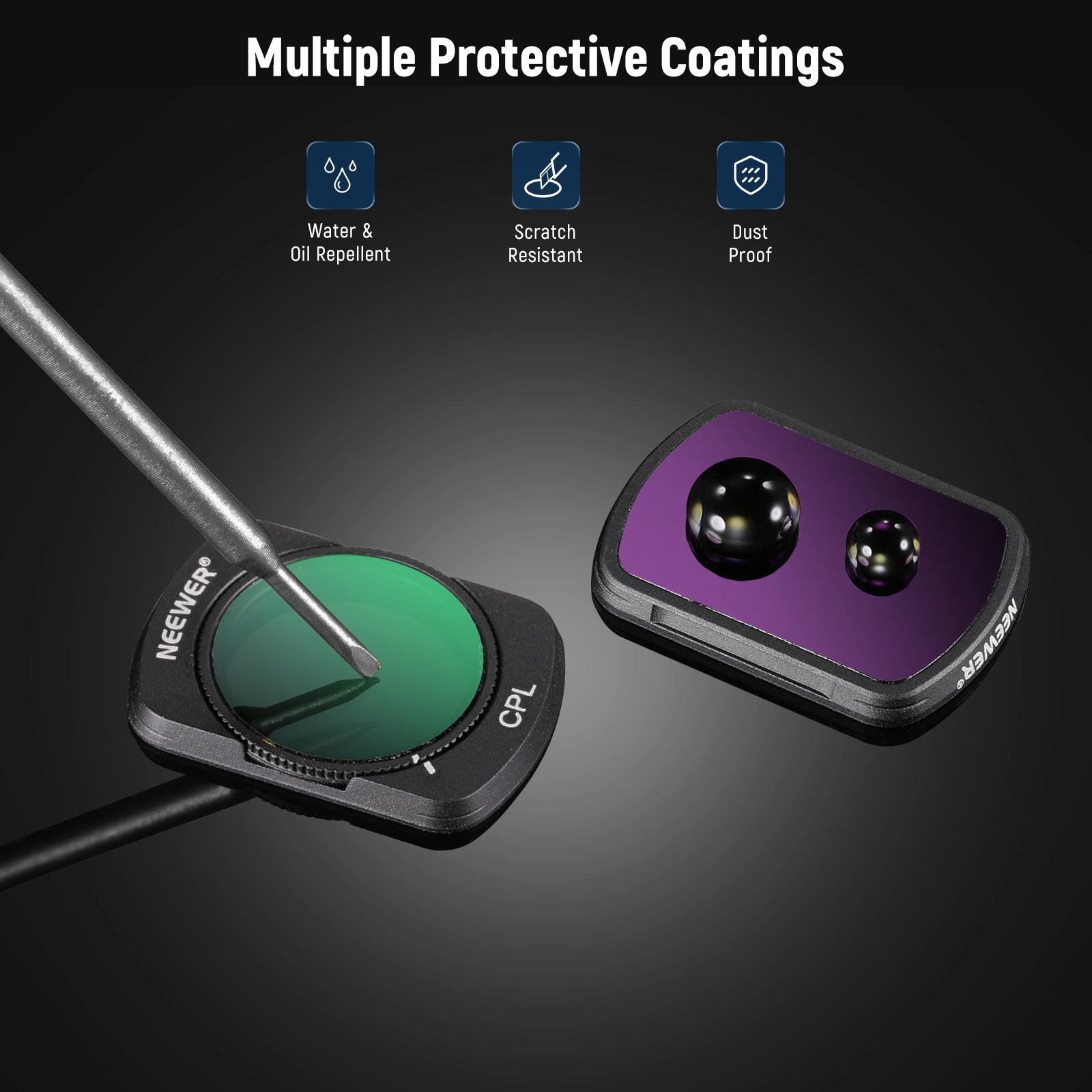 - Vidrio óptico HD con revestimiento múltiple : con 30 capas de revestimientos multifuncionales en ambos lados del vidrio óptico HD, estos filtros para cámaras de acción portátiles son repelentes al agua, resistentes a rayones y a prueba de aceite, lo que garantiza una calidad óptica duradera en entornos desafiantes.