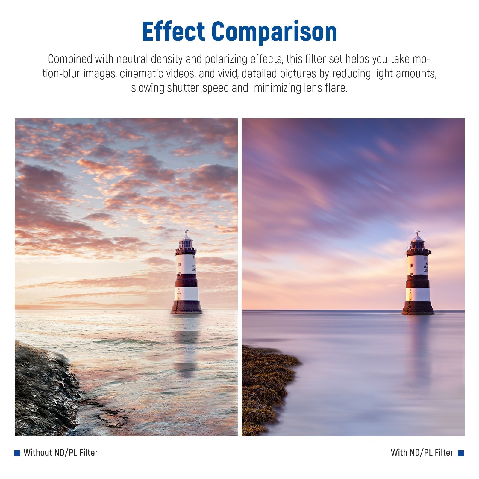 - GRAN FUNCIÓN : Los filtros de lentes ND reducen la cantidad de luz que llega a la película sin afectar el color; ND8 reduce la exposición en 3 paradas; ND16 reduce la exposición en 4 pasos; ND32 reduce la exposición en 5 paradas; ND64 reduce la exposición en 6 paradas; Los filtros ND/PL pueden eliminar reflejos no deseados al capturar vídeo cinematográfico