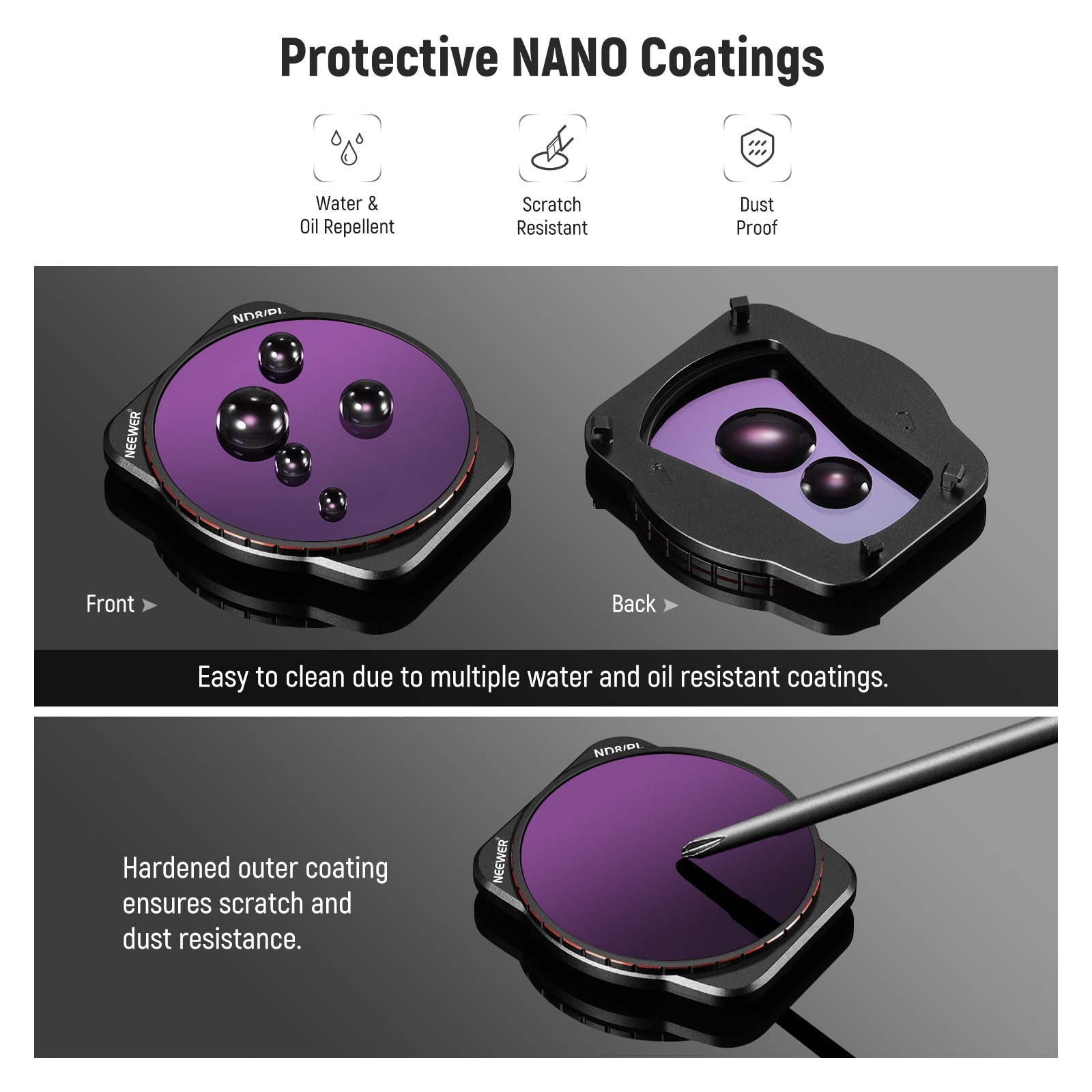 - Vidrio óptico HD con revestimiento NANO : con 30 capas de revestimientos NANO multifuncionales en ambos lados del vidrio óptico HD, estos filtros son repelentes al agua, resistentes a los arañazos y al aceite.