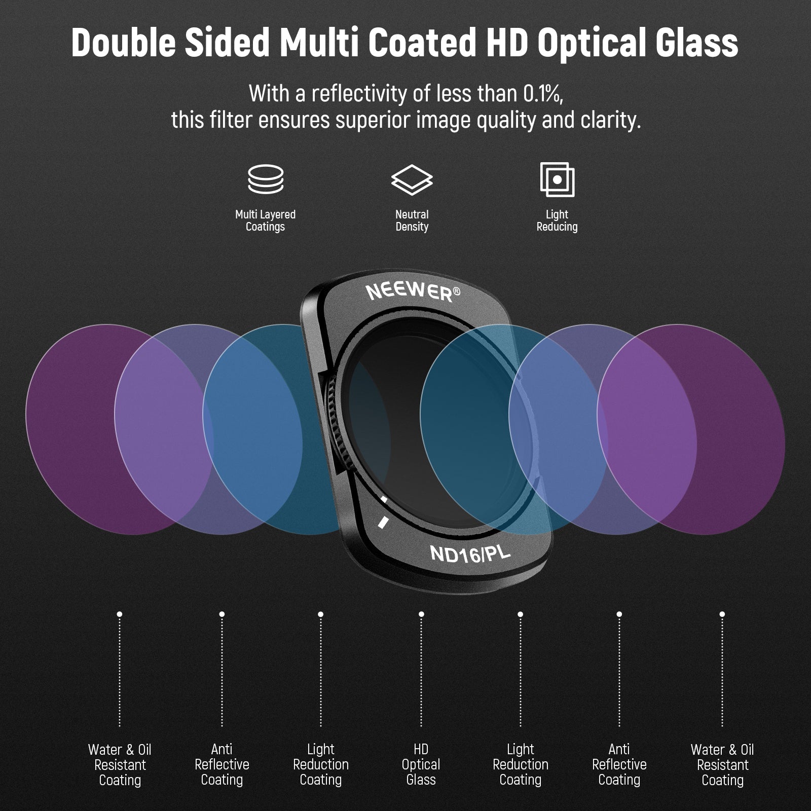 - Vidrio óptico HD multicapa : con 30 capas de revestimientos multifuncionales en ambos lados del vidrio óptico HD, estos filtros de cámara de acción portátil son repelentes al agua, resistentes a rayones y a prueba de aceite, lo que garantiza una calidad óptica duradera en entornos desafiantes.