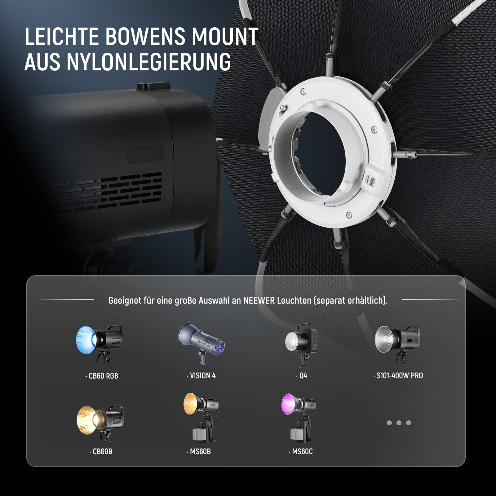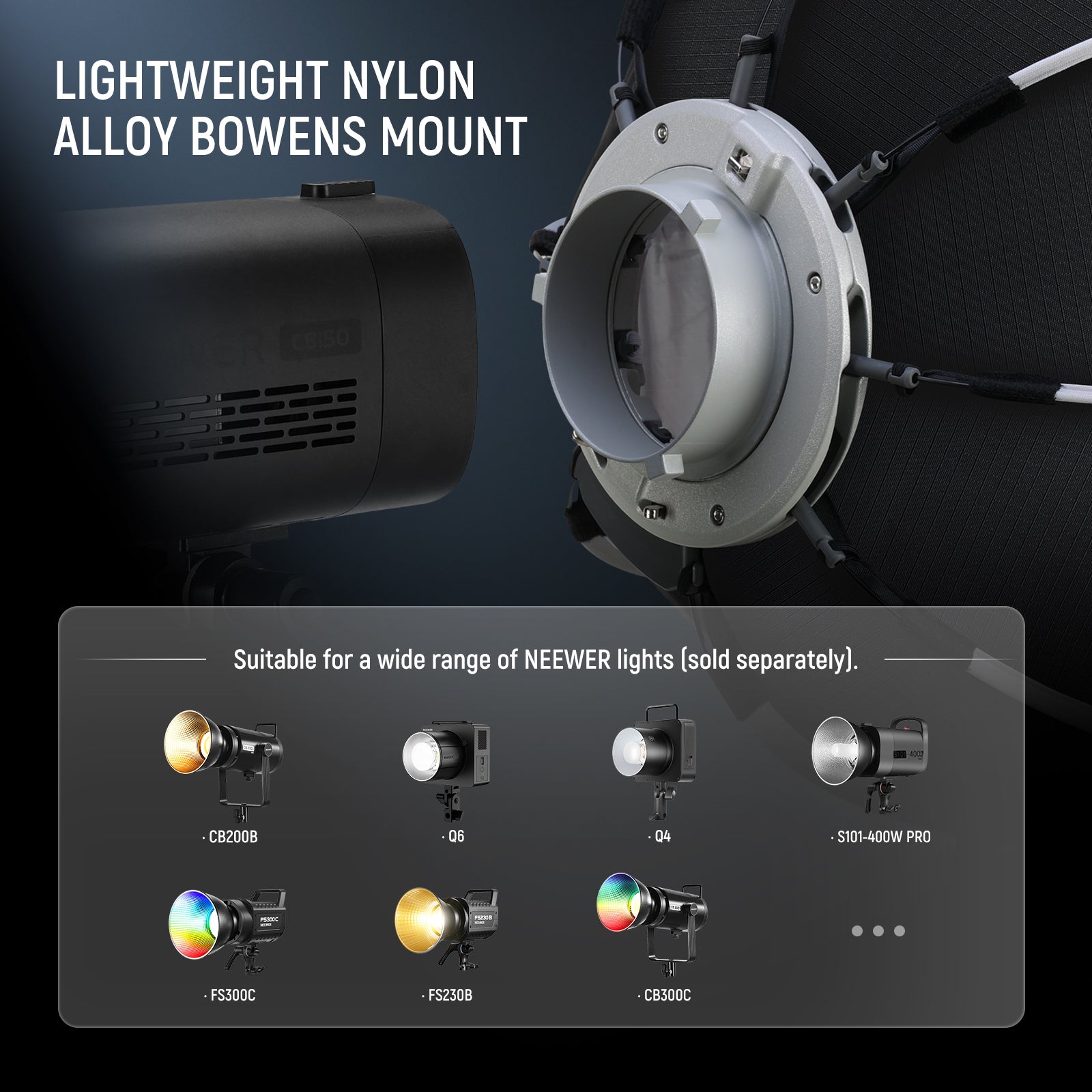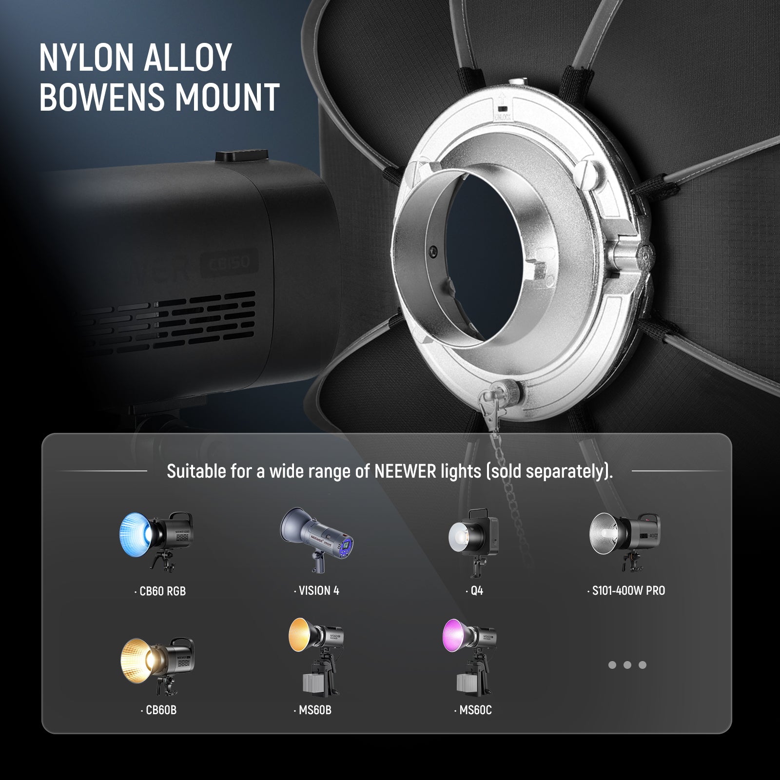- Fijación mediante montura Bowens : al conectarse mediante montura Bowens, la softbox es compatible con Aputure 120D, compatible con Godox SL60w, compatible con SmallRig RC 120D RC 120B y NEEWER Q4, AS600B, CB300B, CB300C, CB200, CB200B, CB60, CB60B, S101-300W PRO, S101-400W PRO, S102-400W PRO, Vision 4, Q300 y otras luces estroboscópicas de estudio y luces de video LED continuas con montura Bowens