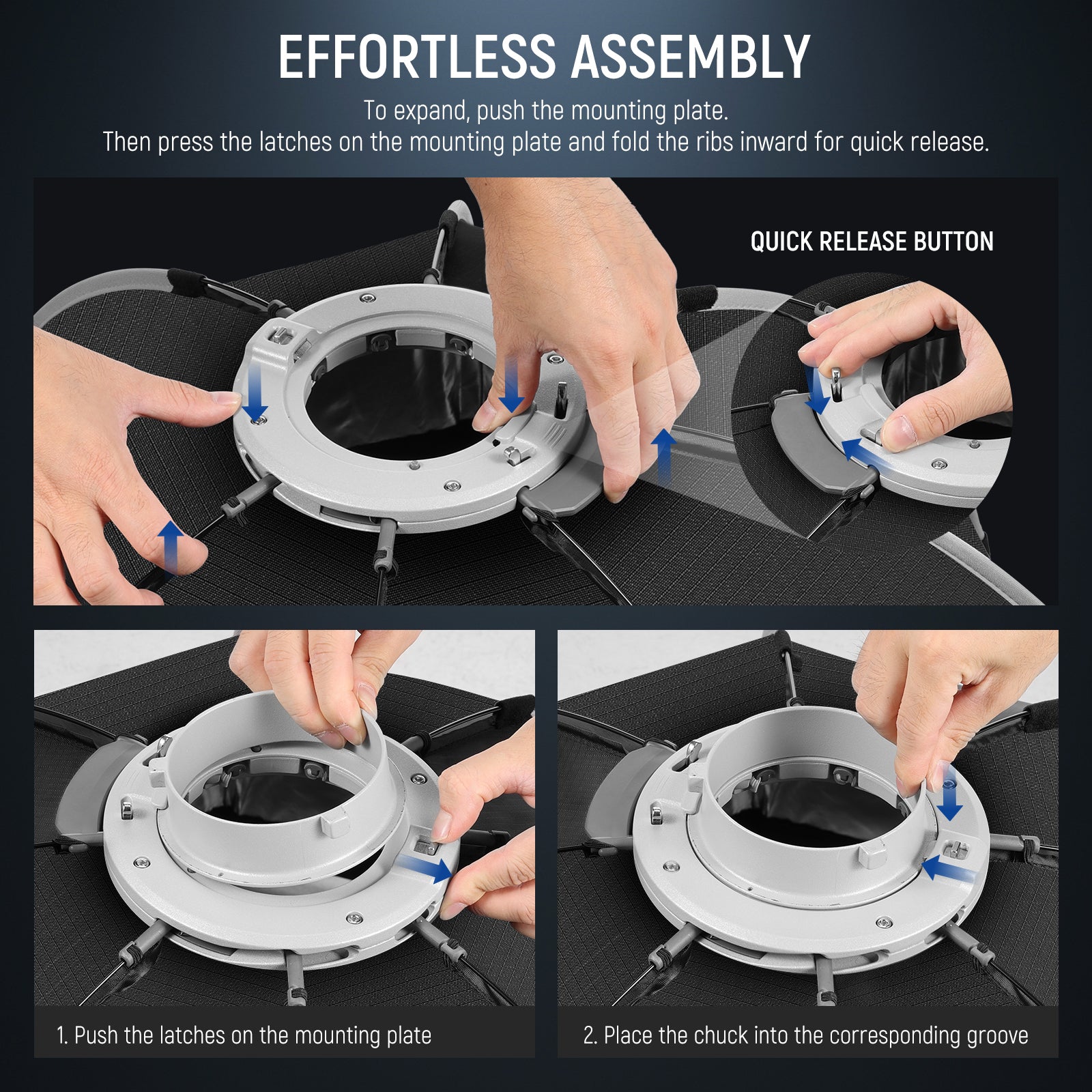 - Montaje sin esfuerzo : con solo presionar la placa de montaje, la caja de luz se despliega y se bloquea sin esfuerzo en su lugar, con los cierres de bucle y gancho para asegurar las capas difusoras y la rejilla incluidas, y está lista para usar. Cuando llegue el momento de guardar, presione los pestillos de la placa de montaje y doble las costillas hacia adentro para una liberación rápida. 8 costillas resistentes y robustas le dan a esta caja de luz una durabilidad incomparable que puede soportar decenas de miles de presiones sin deformarse durante años de uso.