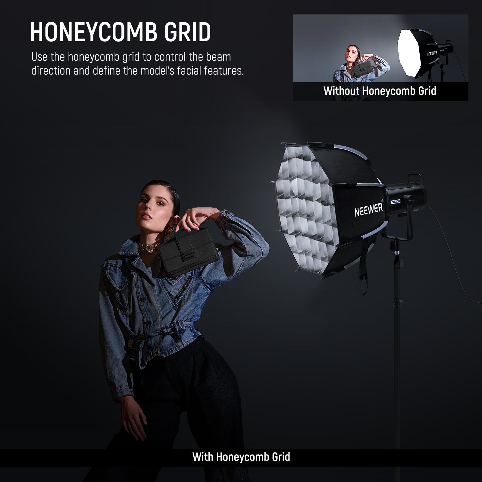 - Rejilla y difusores en forma de panal : el kit de iluminación con softbox incluye difusores internos y externos que se pueden combinar para lograr una luz aún más suave y difusa. La rejilla en forma de panal dirige la luz a 45° y reduce la dispersión, lo que proporciona un efecto de iluminación suave pero impactante que define la estructura facial de la modelo.