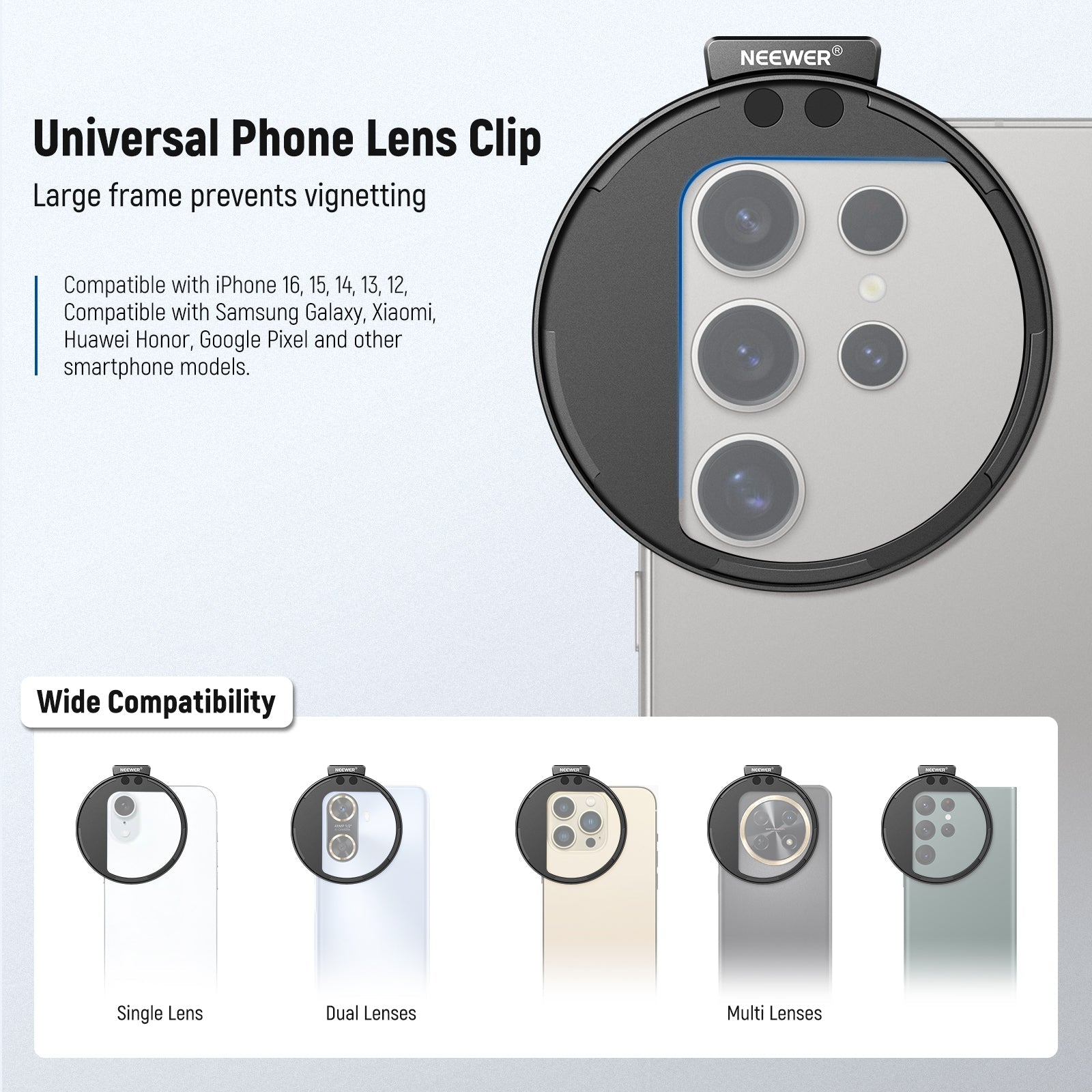 - Clip universal para lente de teléfono : Se fija firmemente a la mayoría de los smartphones con almohadillas de goma para protegerlos de rayones. Compatible con iPhone 16, 16 Pro, 16 Pro Max, 16 Pro Max Plus, 15, 15 Pro, 15 Pro Max, 15 Pro Max Plus, 14, 13, 13 mini, 12, Samsung Galaxy S25 Ultra, S24 Ultra, S23, S22 y otros modelos de smartphones.