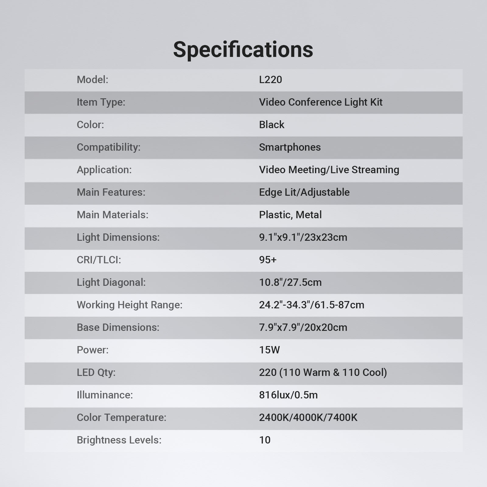 - Iluminación ajustable : la luz de escritorio con 220 LED bicolor ofrece hasta 816 lux/0,5 m, 3 modos CCT y 10 niveles de atenuación para satisfacer las necesidades, desde videoconferencias con computadoras portátiles en la oficina en casa hasta selfies y vlogs, ya que es un elemento esencial e imprescindible para creadores de contenido, influencers y maquilladores.