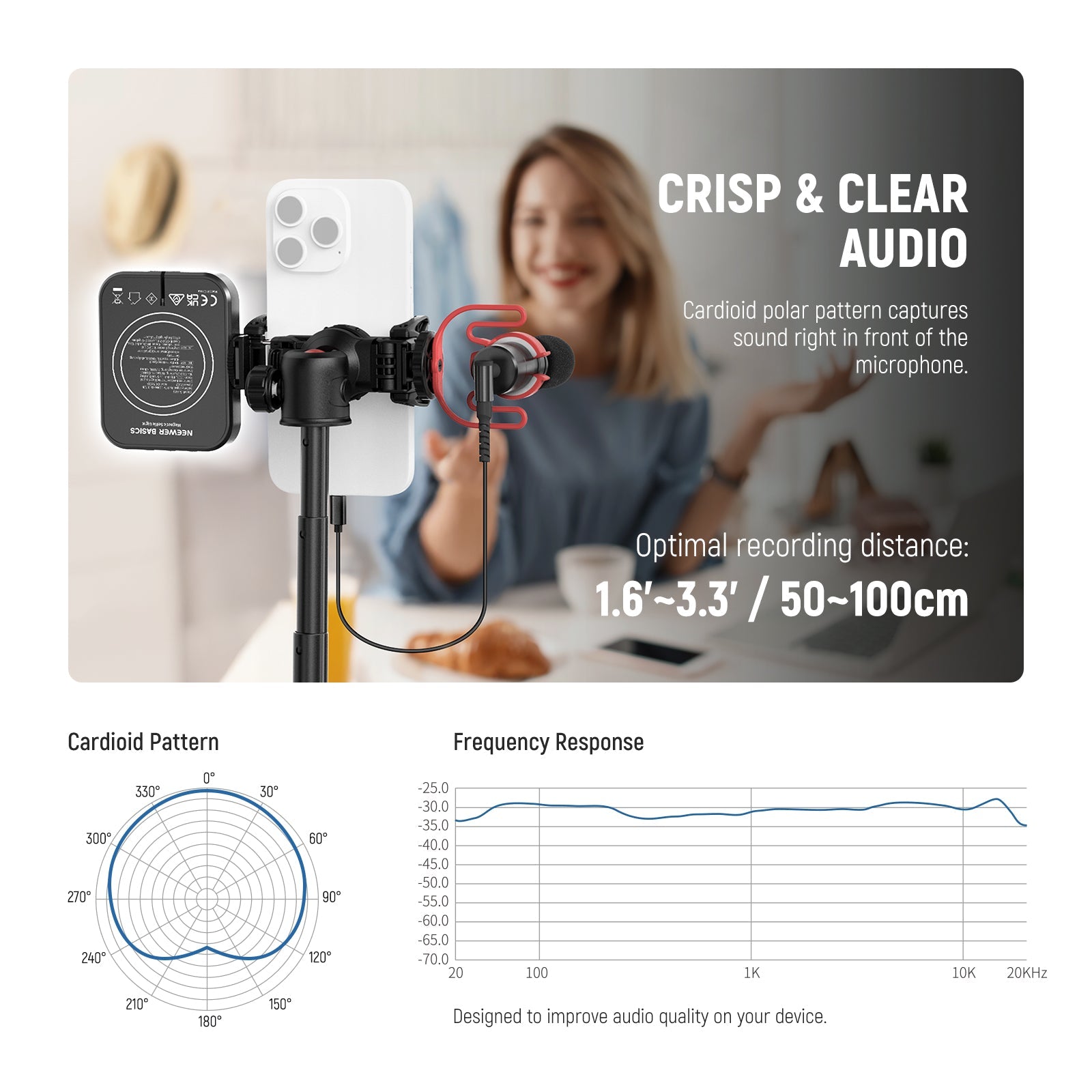 - Plug & Play Small Microphone- Directly plug the VM10 mini portable mic into your device and record professional sound—no batteries are needed. It features a supercardioid polar pattern for clear audio pickup in a range of 1.6'-3.3'/50-100cm. The USB C connector, OTG adapters, and 3.5mm TRS cables are compatible with iPhone, iPad, Android phones, and cameras for vlogging, video recording, streaming, podcast
