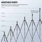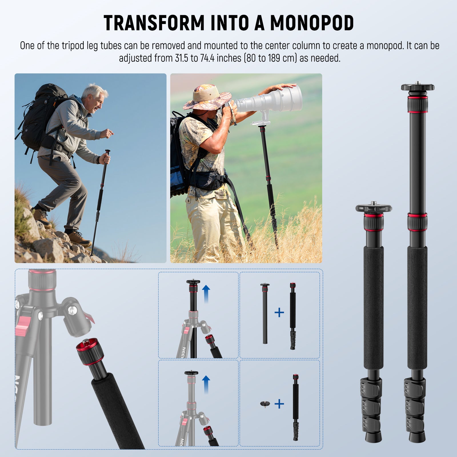 - Transform into a Monopod- One of the tripod leg tubes can be quickly disassembled and connected with the central axis to transform into a monopod, great for capturing quick, moving situations, versatile as a trekking pole during your hikes. The height of the monopod is adjustable from 31.5"/80 cm to 74.4"/189 cm. Ideal tri pod stand with phone holder attachment compatible with iPhone for content creator essential photography videography accessories, influencer must have camera creation gear