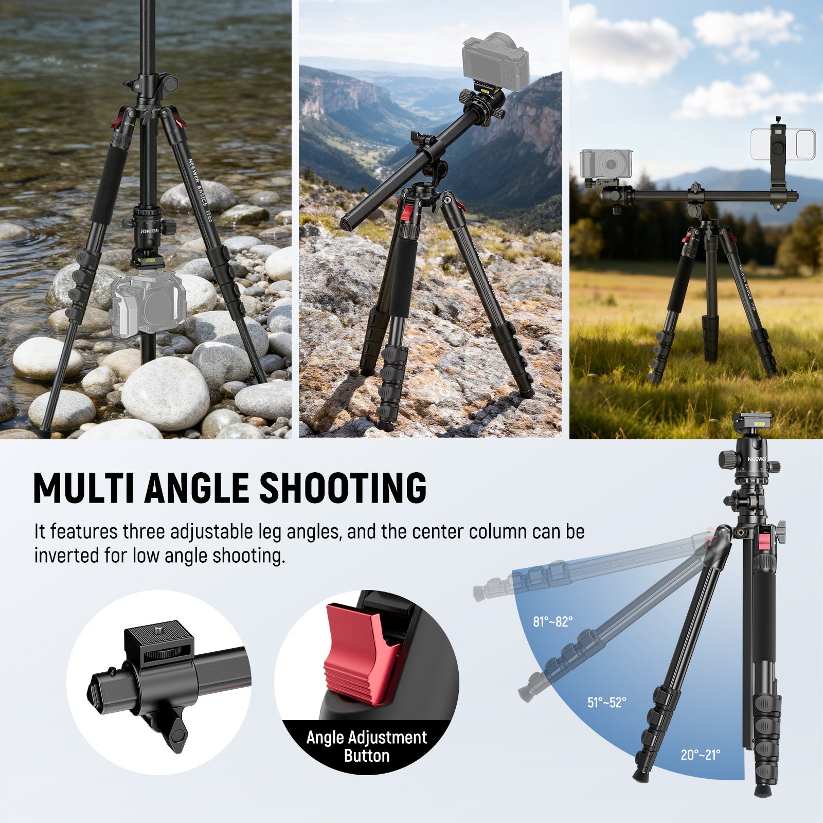 - Presentamos NEEWER BASICS : Sencillo y práctico, NEEWER BASICS es una línea de productos económicos que se centra en funciones y diseños esenciales, sin extras ni materiales innecesarios. El TP66 es un trípode horizontal portátil y potente (51,5-164 cm), con capacidad para hasta 10 kg de equipo y un giro de 360° e inclinación de 180°. El trípode también se puede convertir en un monópode (42,6-130,8 cm) para adaptarse a diversas situaciones.