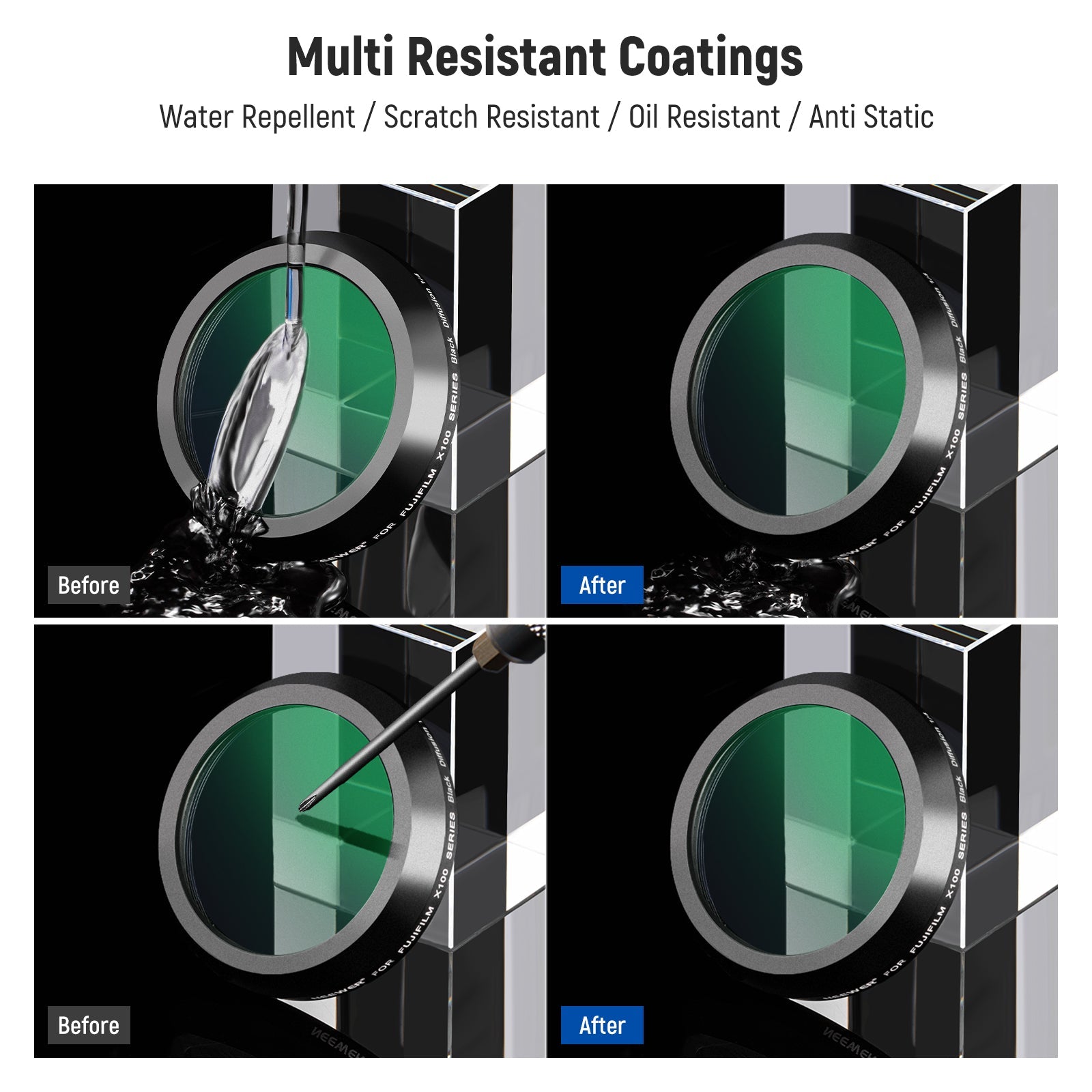 - Construcción de vidrio óptico multicapa : el filtro en sí está hecho de vidrio óptico de alta definición para ayudarlo a tomar imágenes nítidas y claras. Los múltiples revestimientos de doble cara hacen que el filtro sea fácil de limpiar y repelente al agua, resistente a los arañazos, al aceite y a las huellas dactilares.