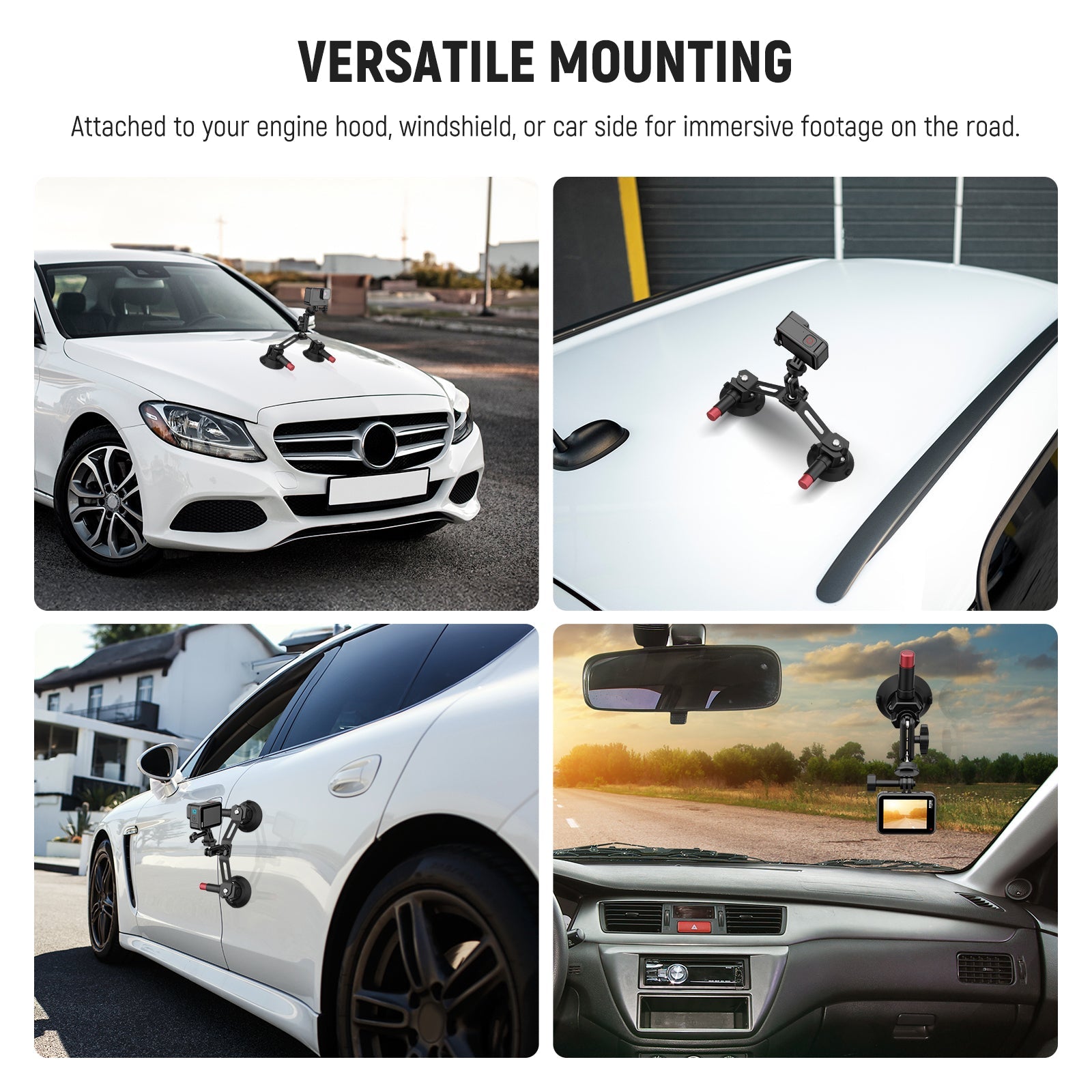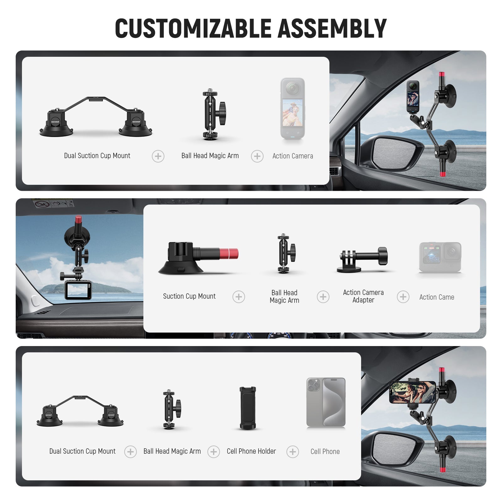 - Kit de montaje para coche con doble ventosa : Captura ángulos de conducción únicos desde el capó, el parabrisas (interior/exterior), el salpicadero o el lateral del coche para disfrutar de una experiencia de vídeo inmersiva en primera persona. Este soporte para coche con ventosa fija de forma segura tu cámara de acción (adaptador incluido) o smartphone (soporte incluido) con dos potentes ventosas y permite un posicionamiento flexible gracias al brazo mágico de doble rótula para grabar vídeos desde diversas perspectivas. Nota: Úsalo a velocidades inferiores a 80 km/h para evitar caídas accidentales.
