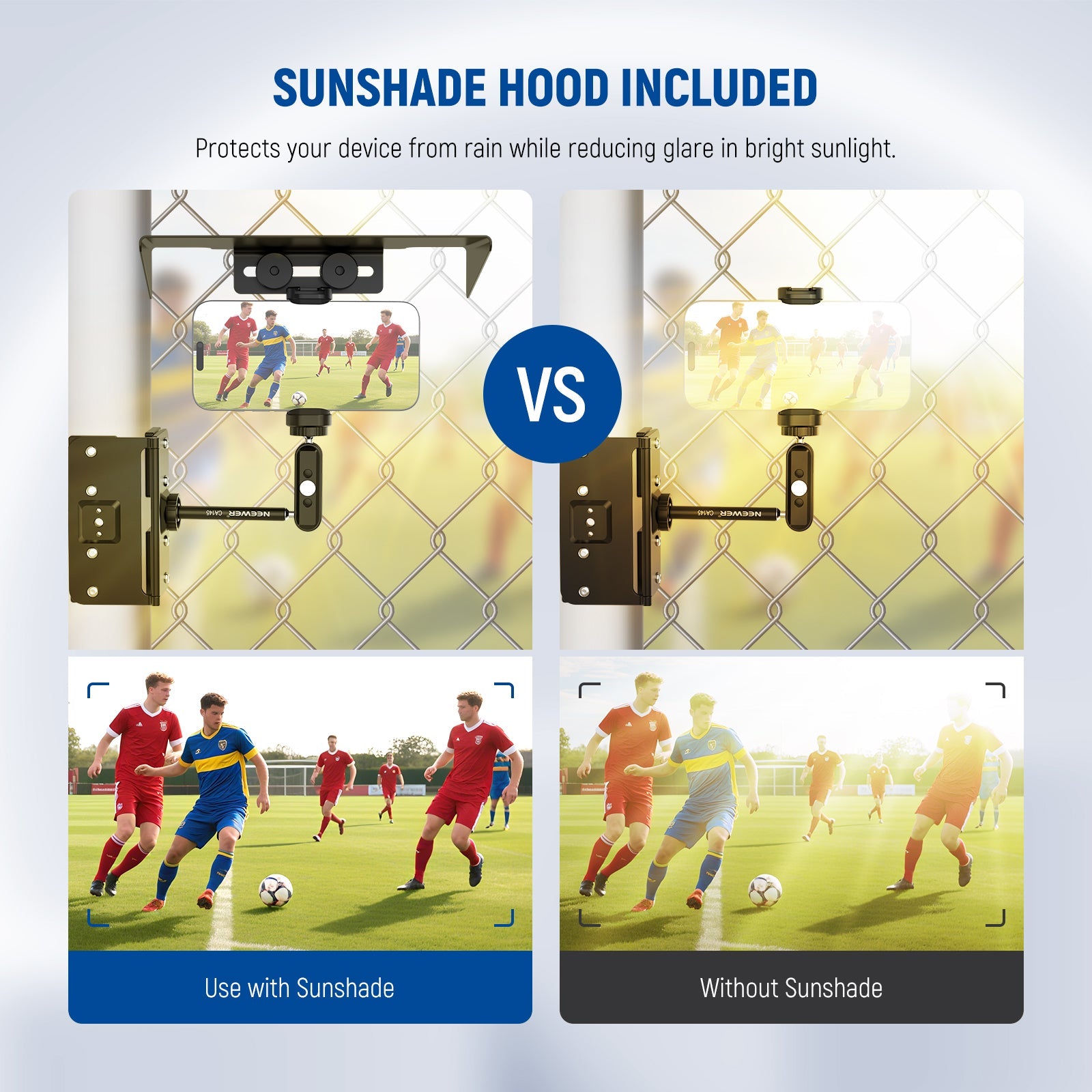 - Foldable Design & Sunshade Included- The foldable hinge design ensures a snug fit around round poles, great for capturing exciting scenes in sports settings as content creator essential photography accessories and influencer must have gear. The sunshade hood mounted on the fence protects your device from rain while reducing glare in bright conditions