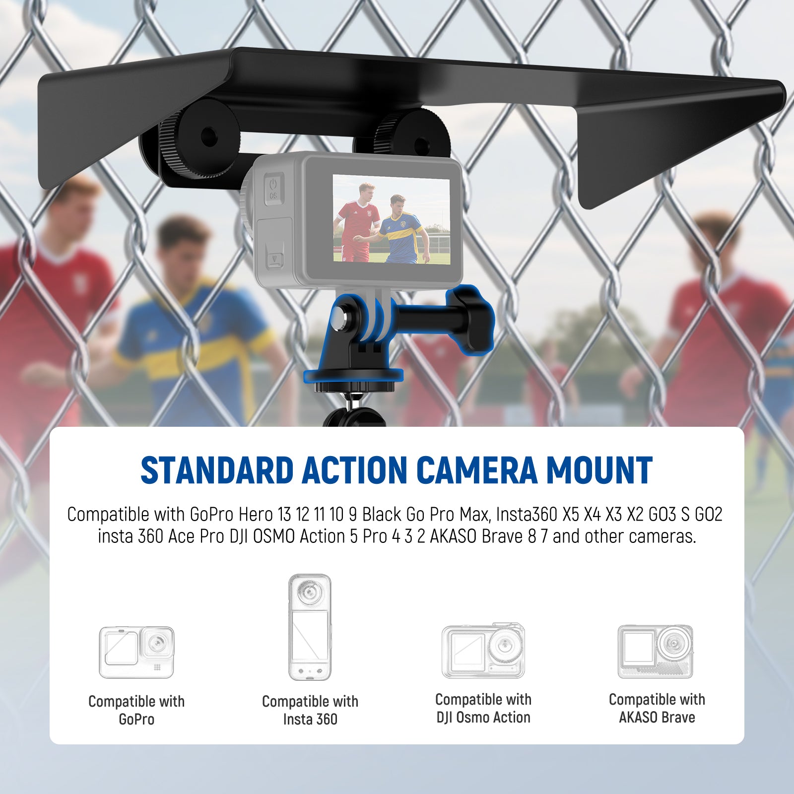 - Dual Mounting Points & Versatile Use- The camera fence mount features a dual mounting point design: one side supports the included magic arm and action camera adapter for game highlights, while the other is equipped with a 1/4" screw hole with locating holes for extra magic arms, phone clamps or other devices, enabling dual position shooting, or for a mobile power to charge your action camera (using the phone clamp, not included), ensuring extended recording