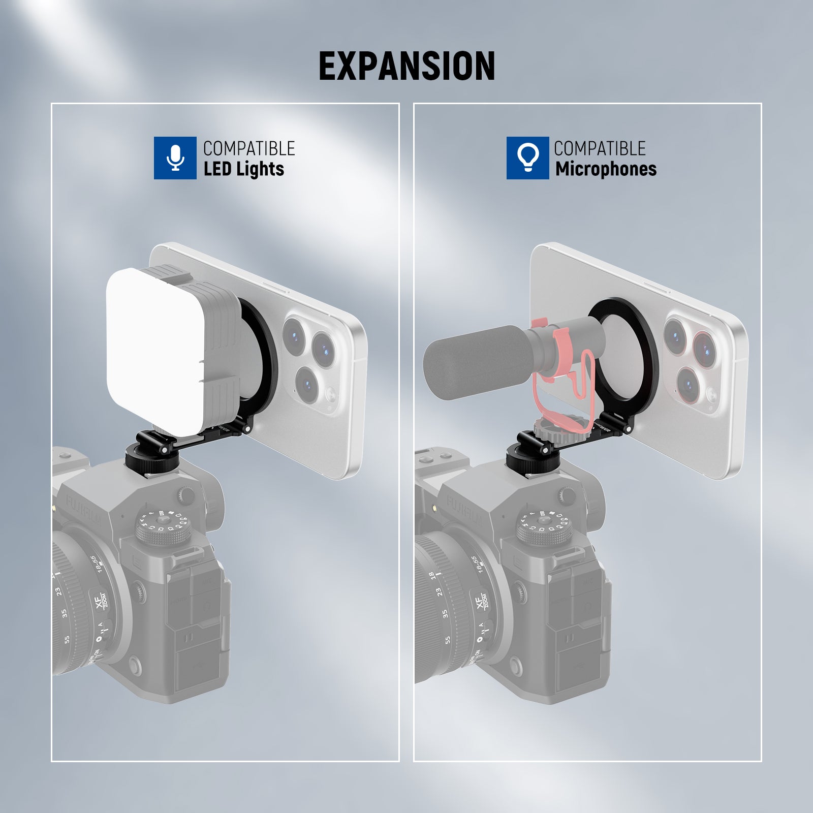 - Soporte magnético para teléfono con zapata fría : conéctelo a una cámara mediante un adaptador de zapata fría, o a un trípode, palo para selfies o estabilizador mediante una rosca de 1/4", ya que todo creador de contenido o influencer esencial debe tener accesorios de fotografía.