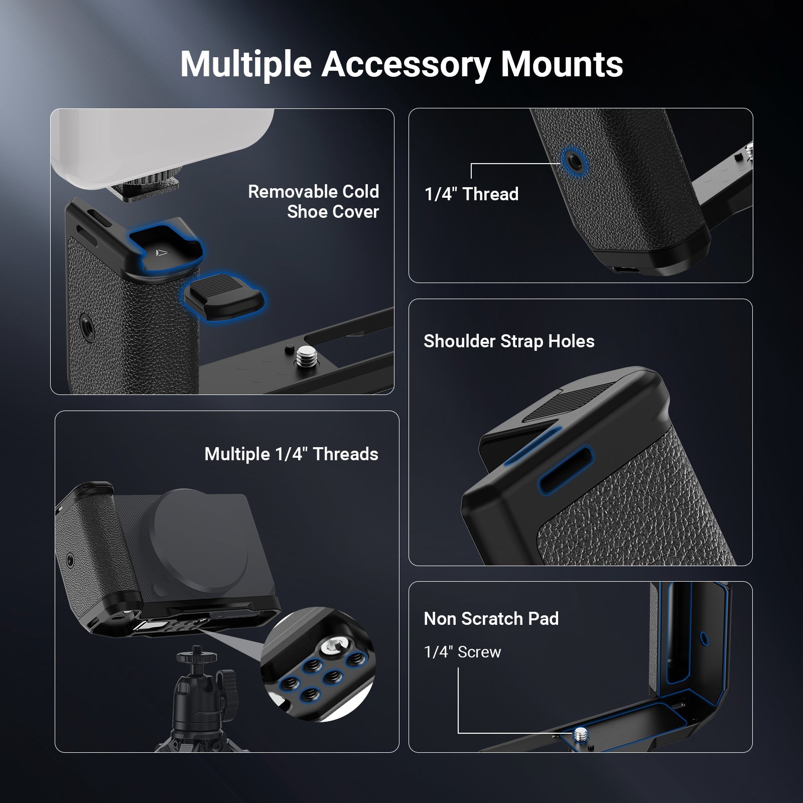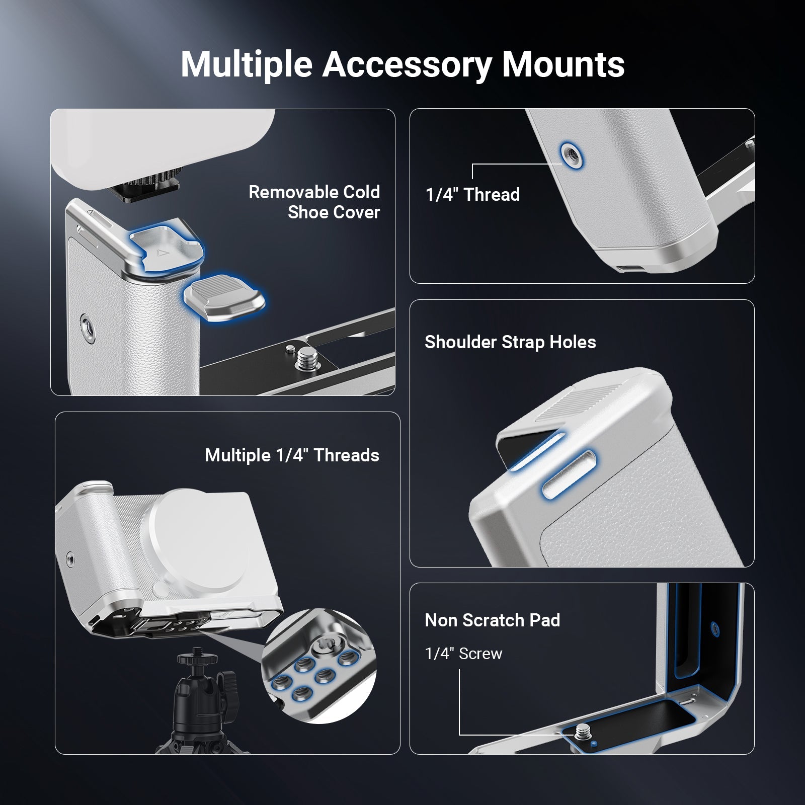 - Cold Shoe & 1/4" Threads- Cold shoe mount with protective cap connects small LED lights, microphones, and other camera accessories. Several 1/4" threads attach to camera stands, handgrips, and tripods