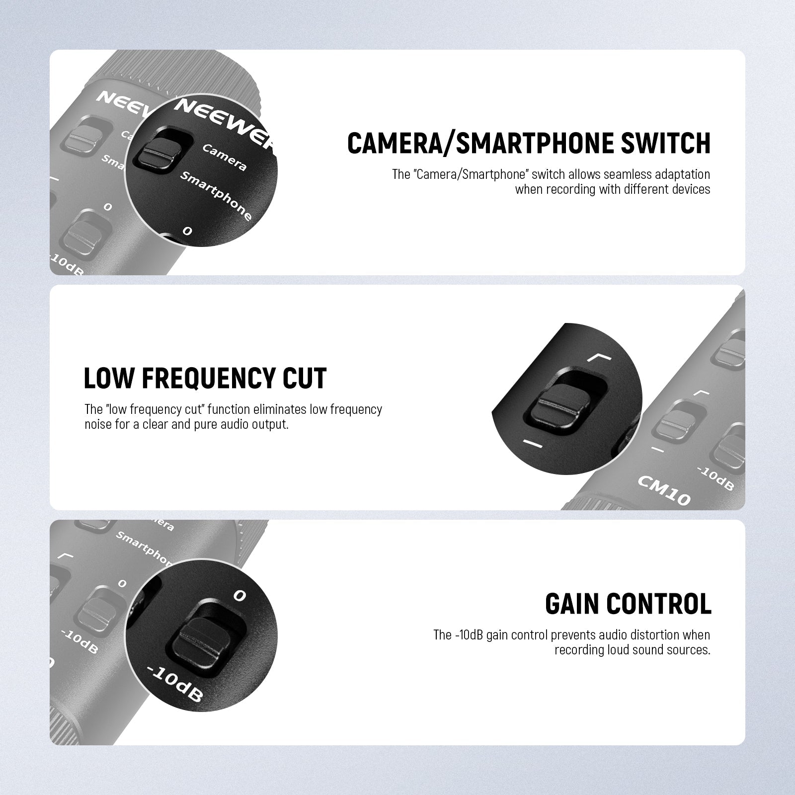 - Control de ganancia y corte de baja frecuencia : La función de corte de baja frecuencia elimina el ruido de baja frecuencia para una salida de audio nítida y pura. El control de ganancia de -10 dB evita la distorsión del audio al grabar fuentes de sonido con volumen alto.