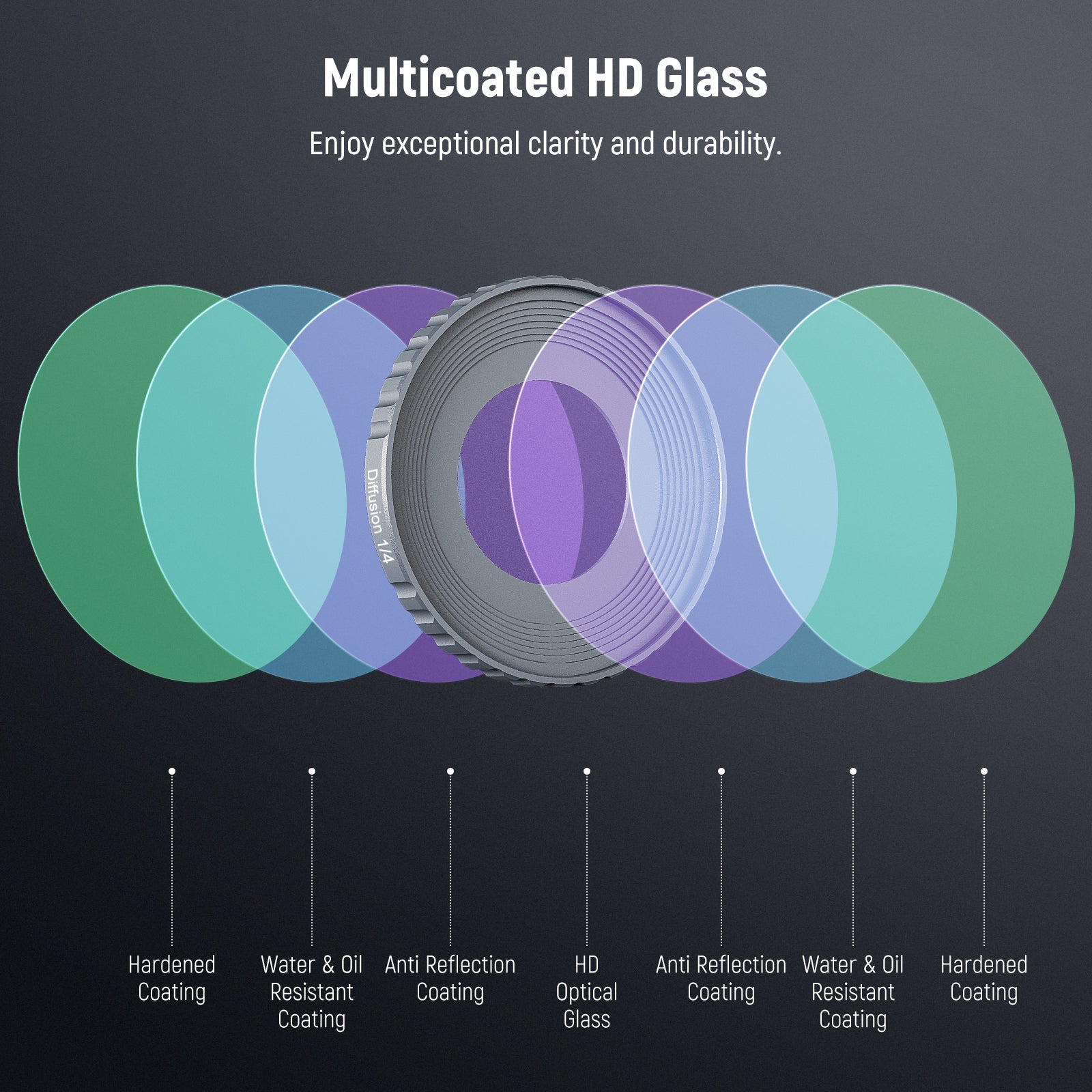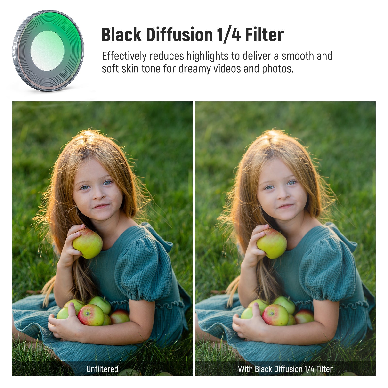 - Efecto cinematográfico suave y de ensueño : el filtro de difusión negro de 1/4 "suaviza la textura de la piel, difumina los reflejos y añade un efecto de ensueño a tus fotos, perfecto para retratos, selfies y vlogs personales.