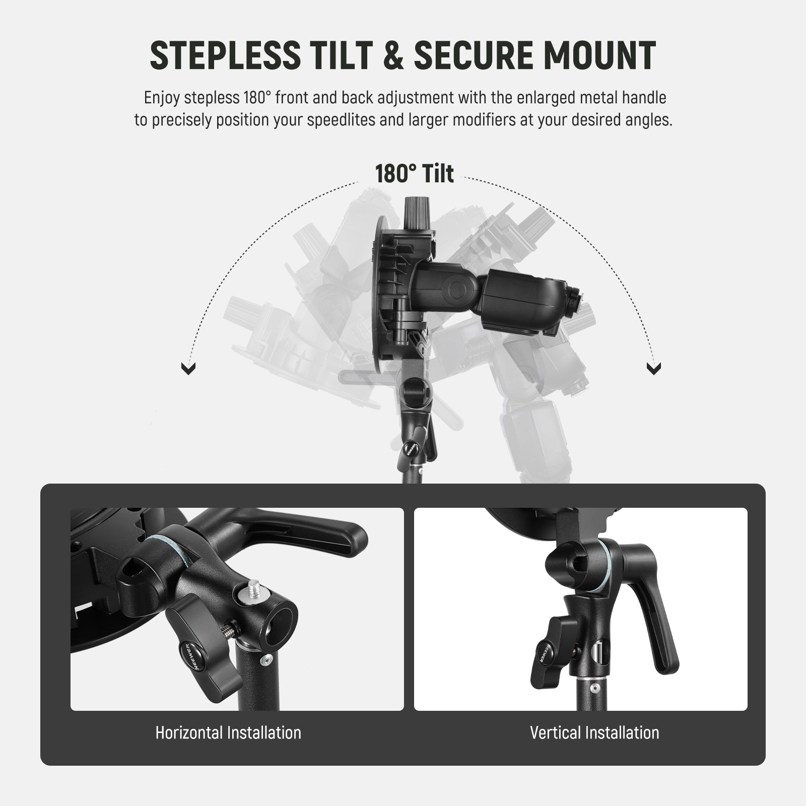 - Inclinación de 180° y montaje seguro : el adaptador de montaje en soporte con un mango grande permite un movimiento de inclinación preciso de 180°. Se puede sujetar de forma segura a un soporte de luz con el perno de 5/8" o funcionar como empuñadura para un uso flexible con la mano.