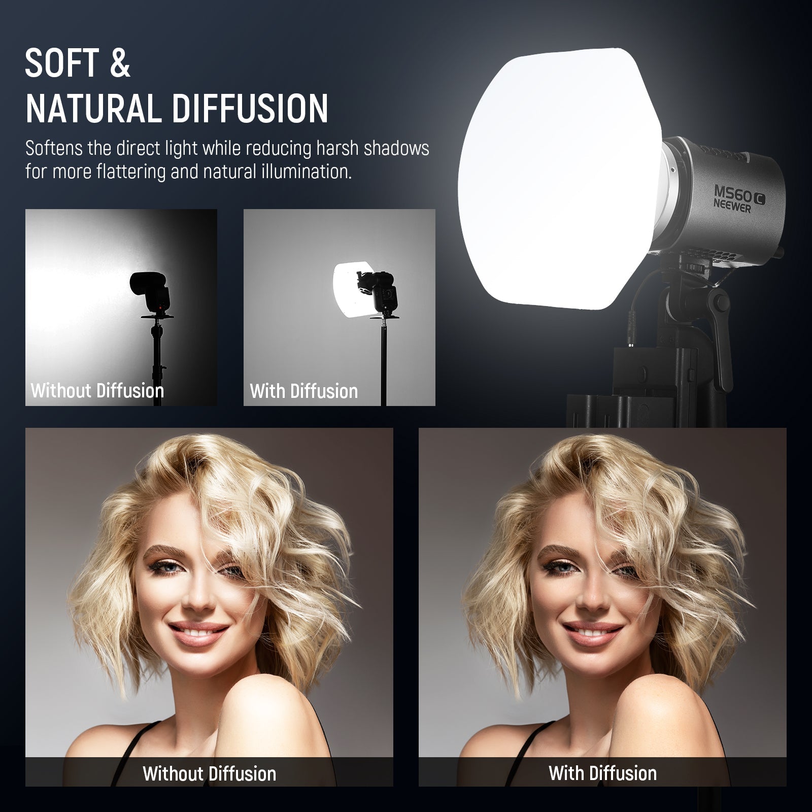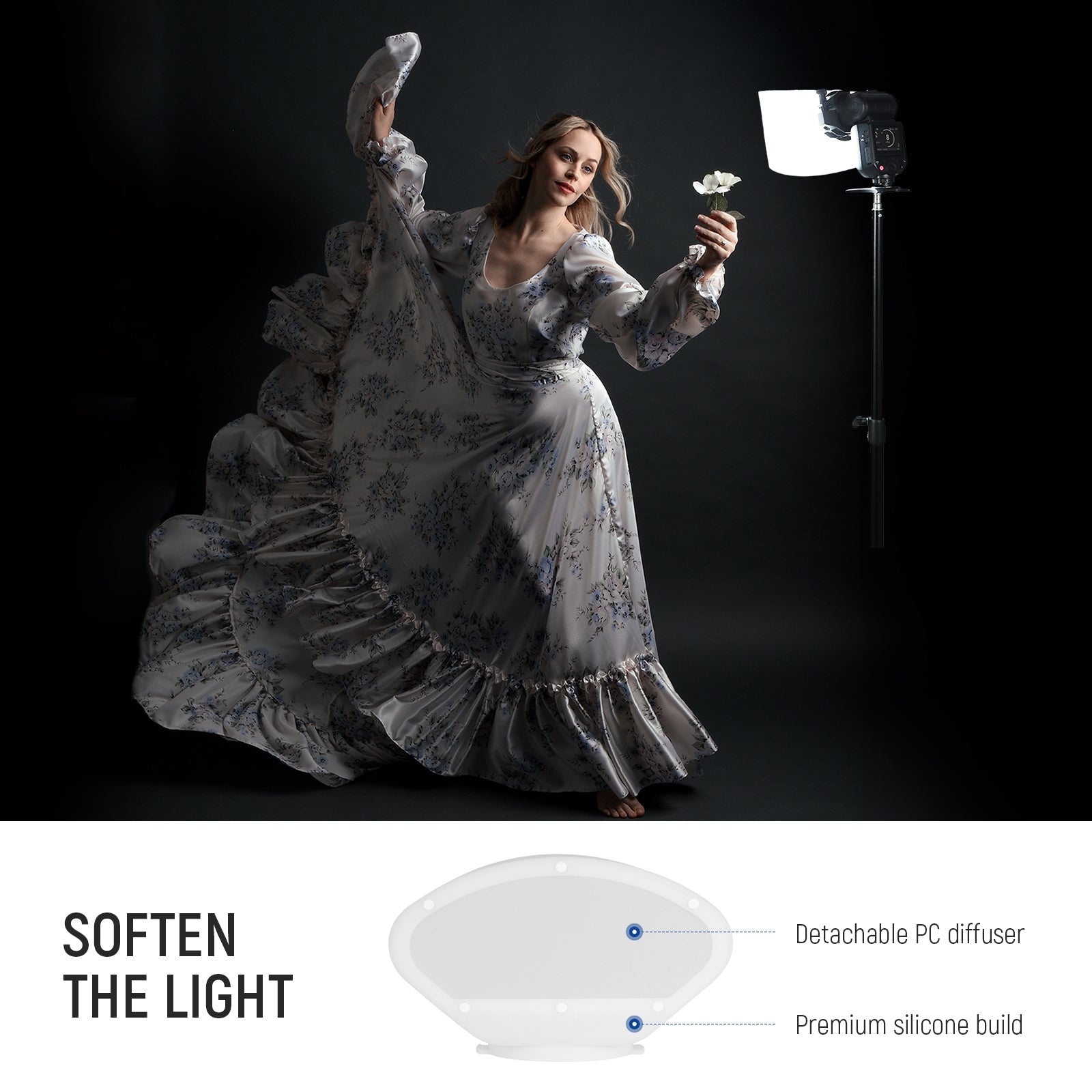 - Ligero y plegable : este difusor suave y flexible se puede ajustar en varias formas y se puede guardar fácilmente en una mochila o maleta para viajar. Con solo 1 lb/420 g, el modificador de luz respetuoso con la piel es resistente a la deformación, los rayones y otros posibles daños, y siempre está listo para usar.