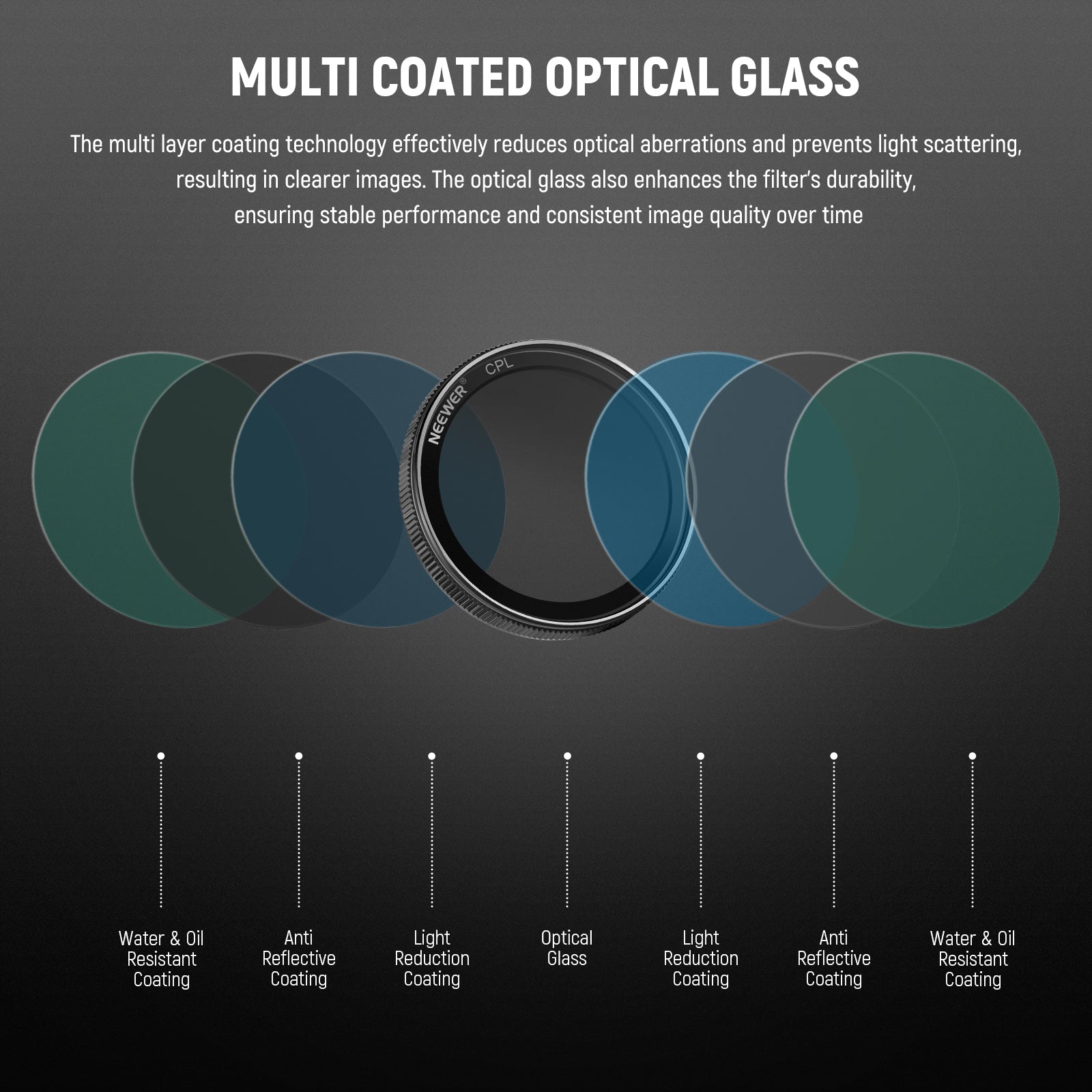 - Vidrio óptico con revestimiento múltiple : la tecnología de revestimiento multicapa reduce eficazmente las aberraciones ópticas y evita la dispersión de la luz, lo que da como resultado imágenes más claras. El vidrio óptico de alta calidad también mejora la durabilidad del filtro, lo que garantiza un rendimiento estable y una calidad de imagen constante a lo largo del tiempo.