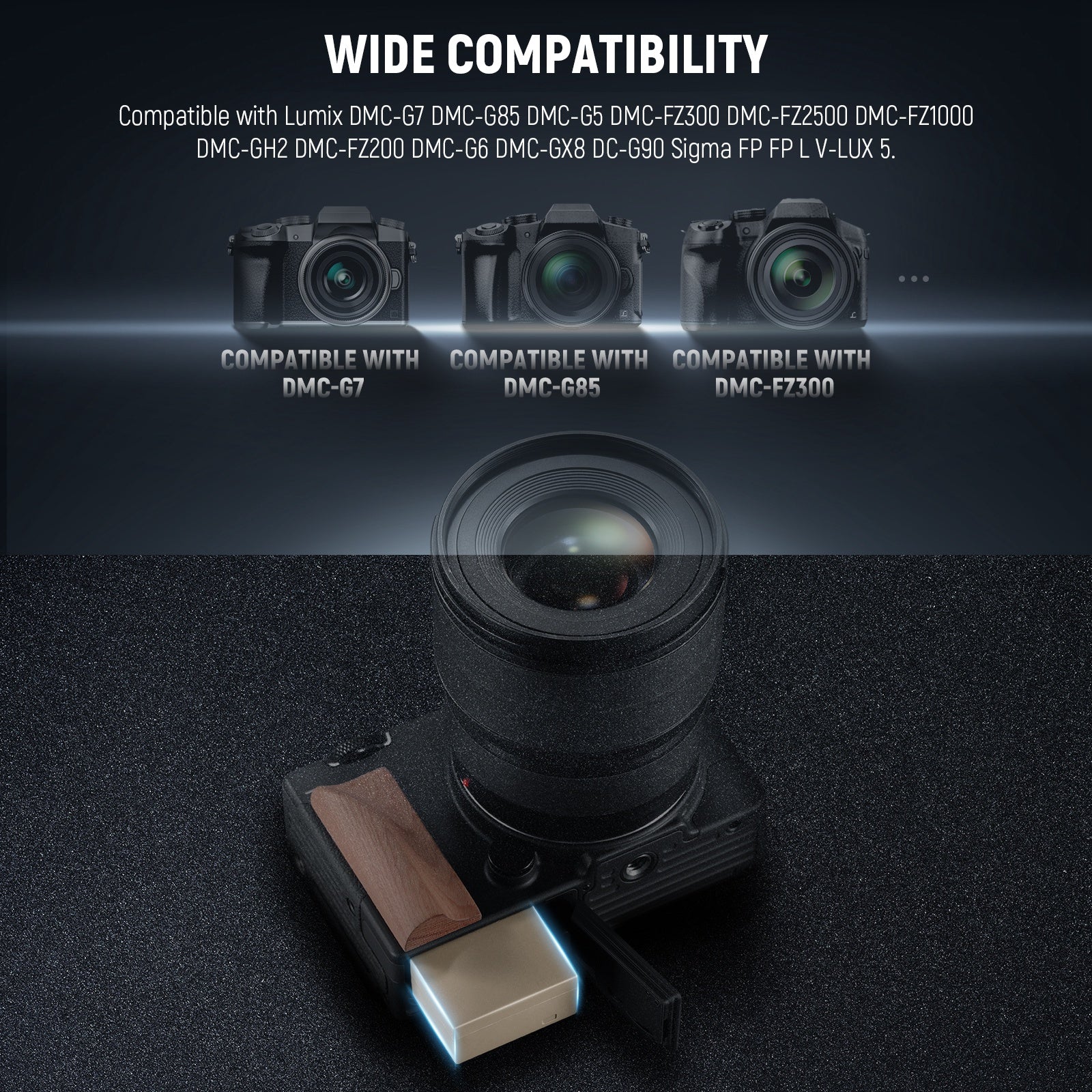- Batería de repuesto para DMW-BLC12 : totalmente compatible con Lumix DMC-G7 DMC-G85 DMC-G5 DMC-FZ300 DMC-FZ2500 DMC-FZ1000 DMC-GH2 DMC-FZ200 DMC-G6 DMC-GX8 DC-G90 Sigma FP FP L V-LUX 5, esta batería decodificada proporciona un nivel de batería constante y estable. El porcentaje de batería se mostrará en la pantalla de la cámara