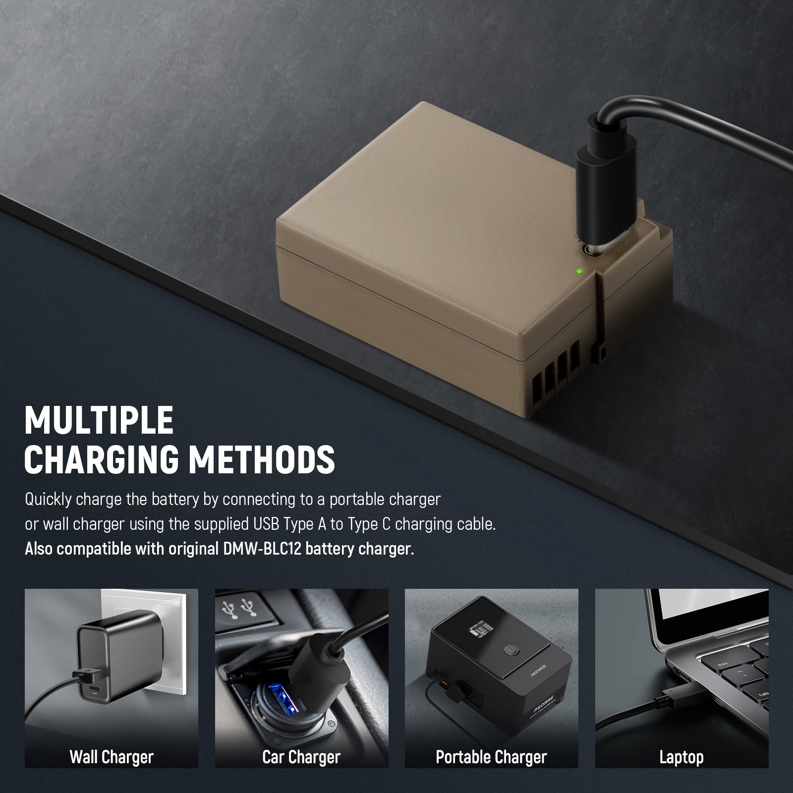 - Puerto de carga USB tipo C : esta batería DMW-BLC12, que cuenta con un puerto de carga USB tipo C, no necesita un cargador de batería externo. Todo lo que necesita para cargarla es un cable USB tipo C (incluido) y un adaptador de corriente USB de 5 V (no incluido).