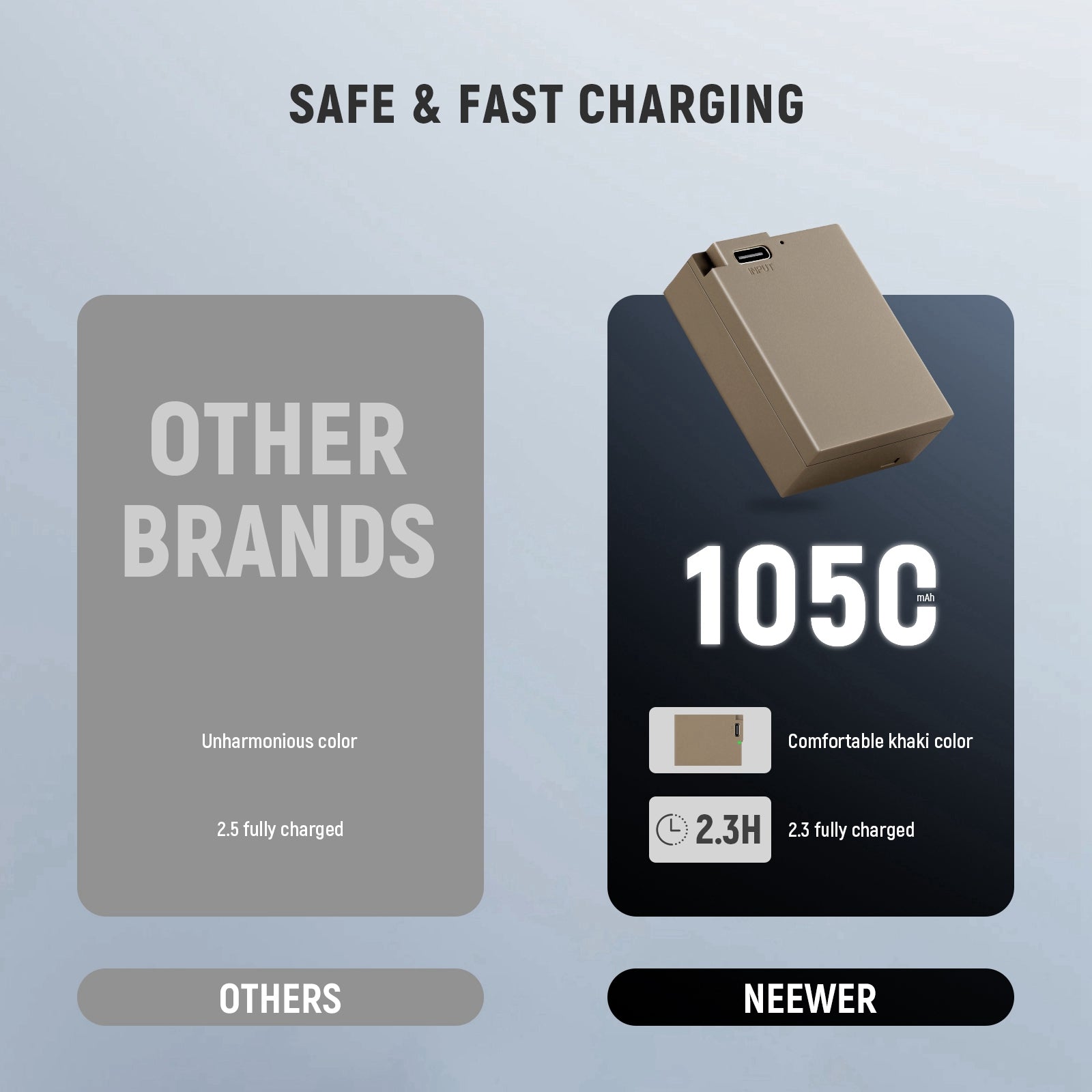 - Alta capacidad de batería : la batería tiene una capacidad de 1100 mAh (7,2 V/7,9 Wh) y se puede cargar por completo en 2,3 horas con un adaptador de corriente USB normal de 5 V y 2 A. Nota: NO se admite la carga rápida PD