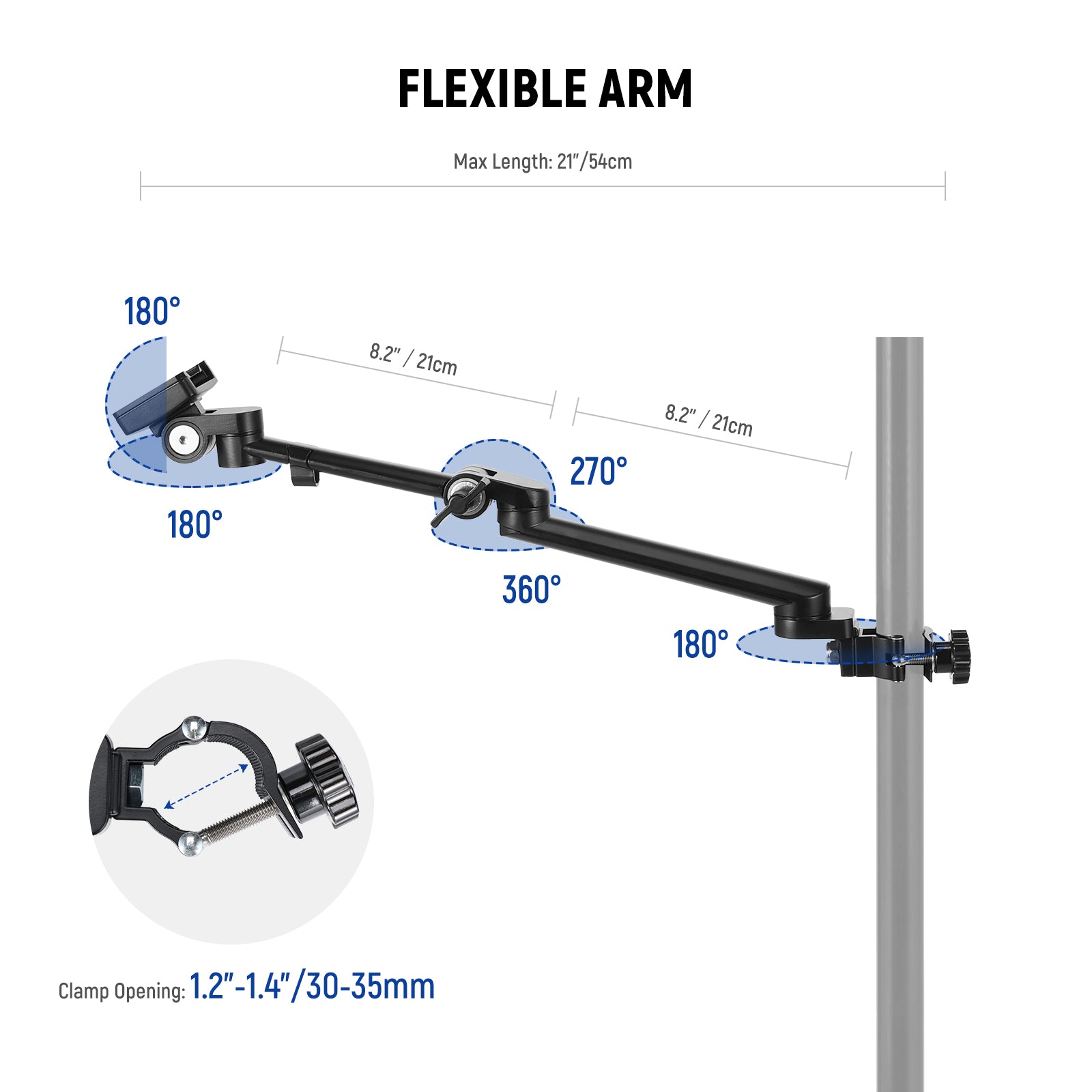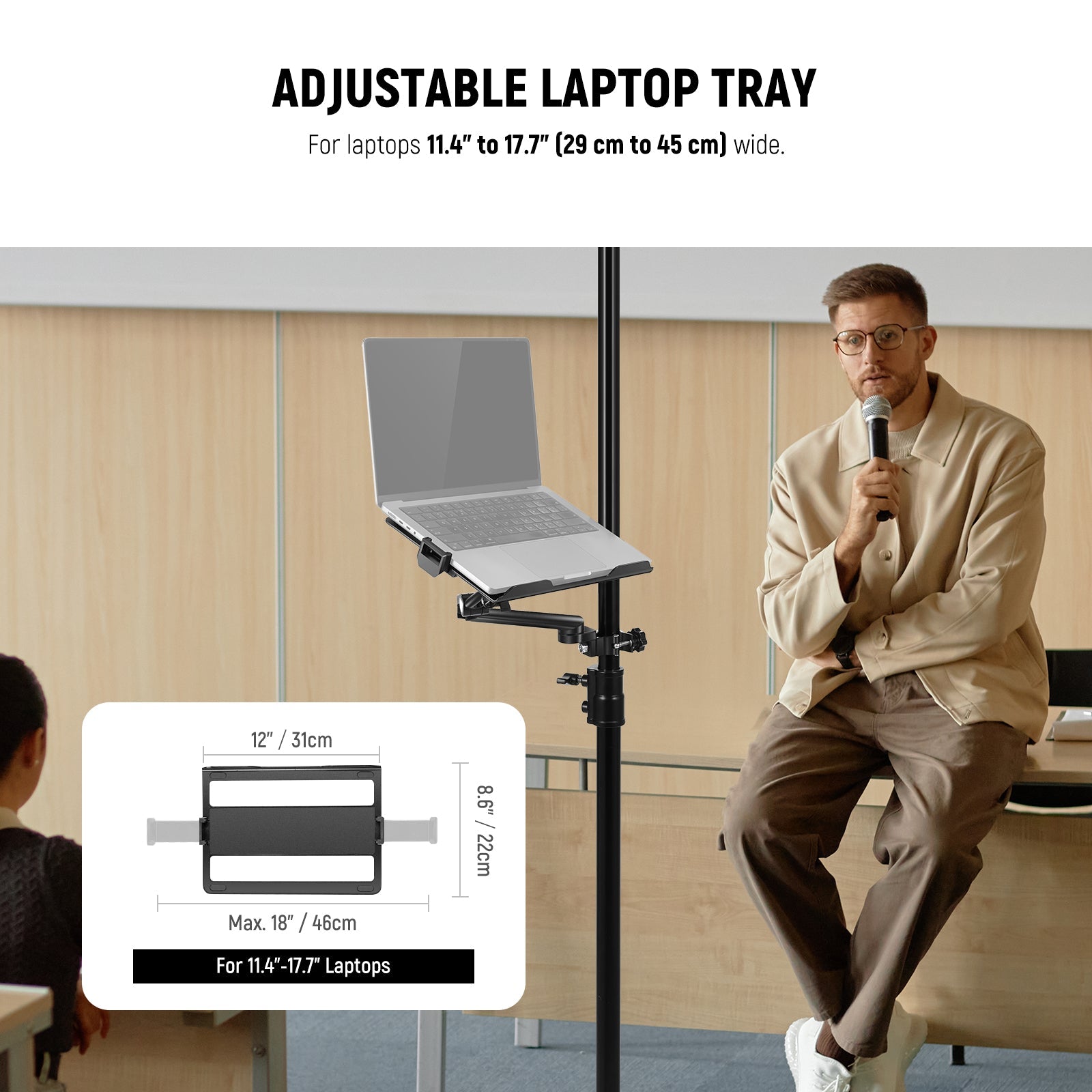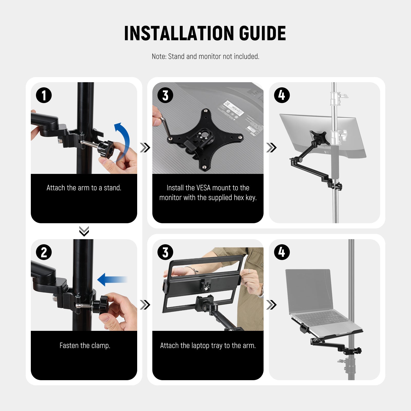 - Brazo ajustable para computadora portátil individual con abrazadera : este DS013 es un brazo resistente para escritorio individual con una capacidad de carga máxima de 17,6 lb (8 kg). El brazo para computadora portátil se ajusta fácilmente en altura y ángulo, lo que lo hace ideal para grabación de video, transmisión o conferencias en línea. El ajuste suave garantiza una posición estable mientras el brazo se bloquea de forma segura en su lugar. Nota: solo se incluye el brazo para bandeja para computadora portátil