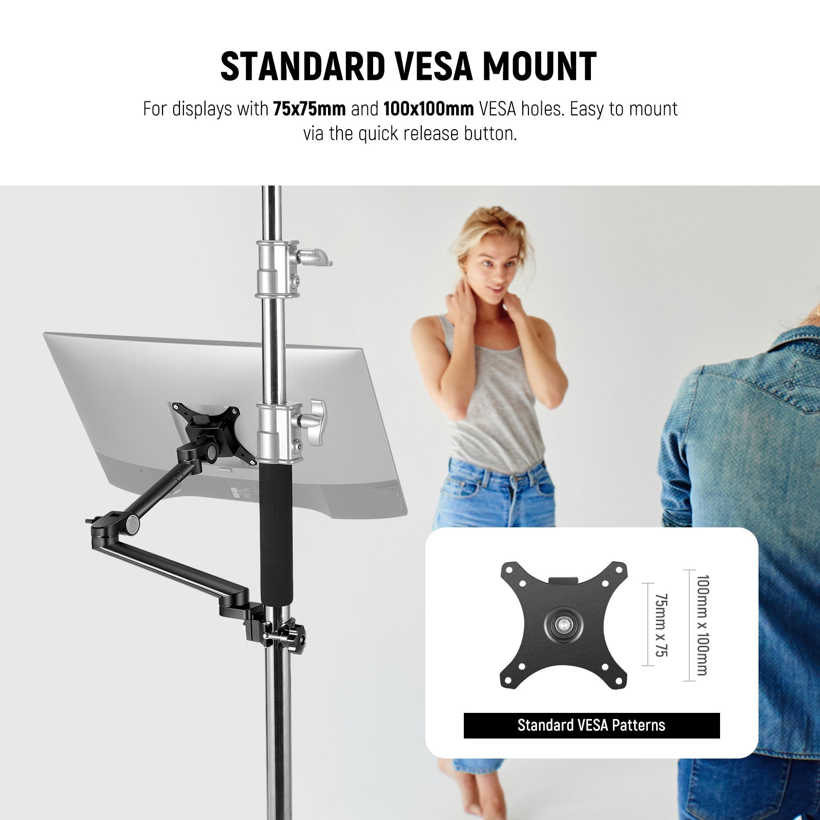 - Placa VESA versátil : el kit de brazo de montaje para escritorio de monitor de computadora portátil incluye una placa de montaje compatible con VESA (modo VESA estándar). Admite una amplia gama de monitores con orificios de montaje de 75 x 75 mm y 100 x 100 mm y viene con un botón de liberación rápida fácil de usar para una instalación y extracción sencillas