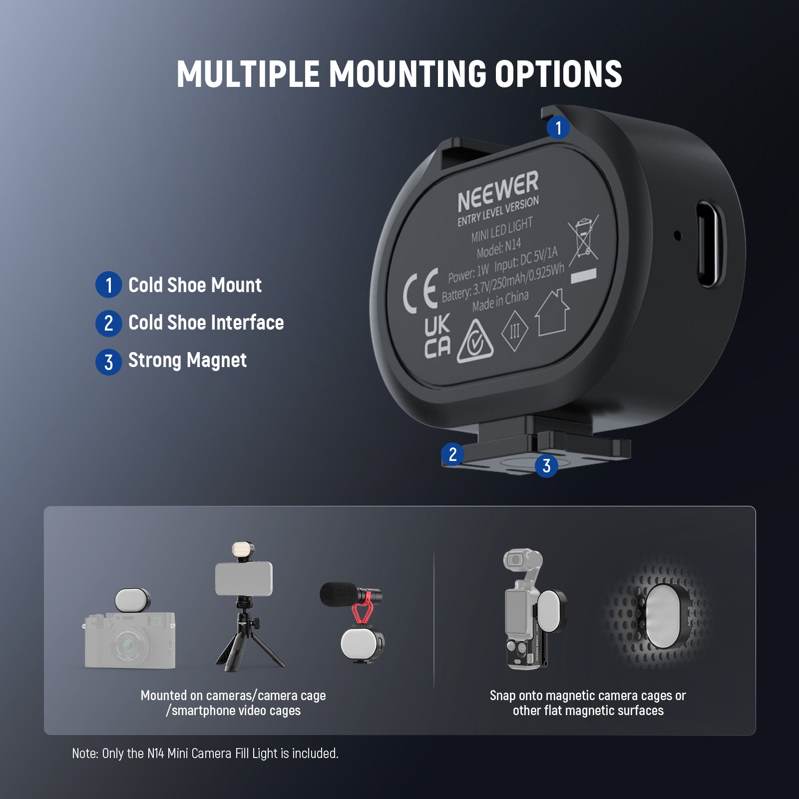- Quick Magnetic Attachment with Cold Shoes- Designed for camera fill lighting and phone photography videography, the N14 features a cold shoe mount and a cold shoe interface on the sides for cold shoe cams, camera cages, or phone video cages. The cold shoe mount features a strong magnet for swift attachment to magnetic camera cages or other flat magnetic surfaces. Can works with NEEWER M21 fill light and AC024 accessories extension adapter bracket compatible with DJI OSMO pocket 3
