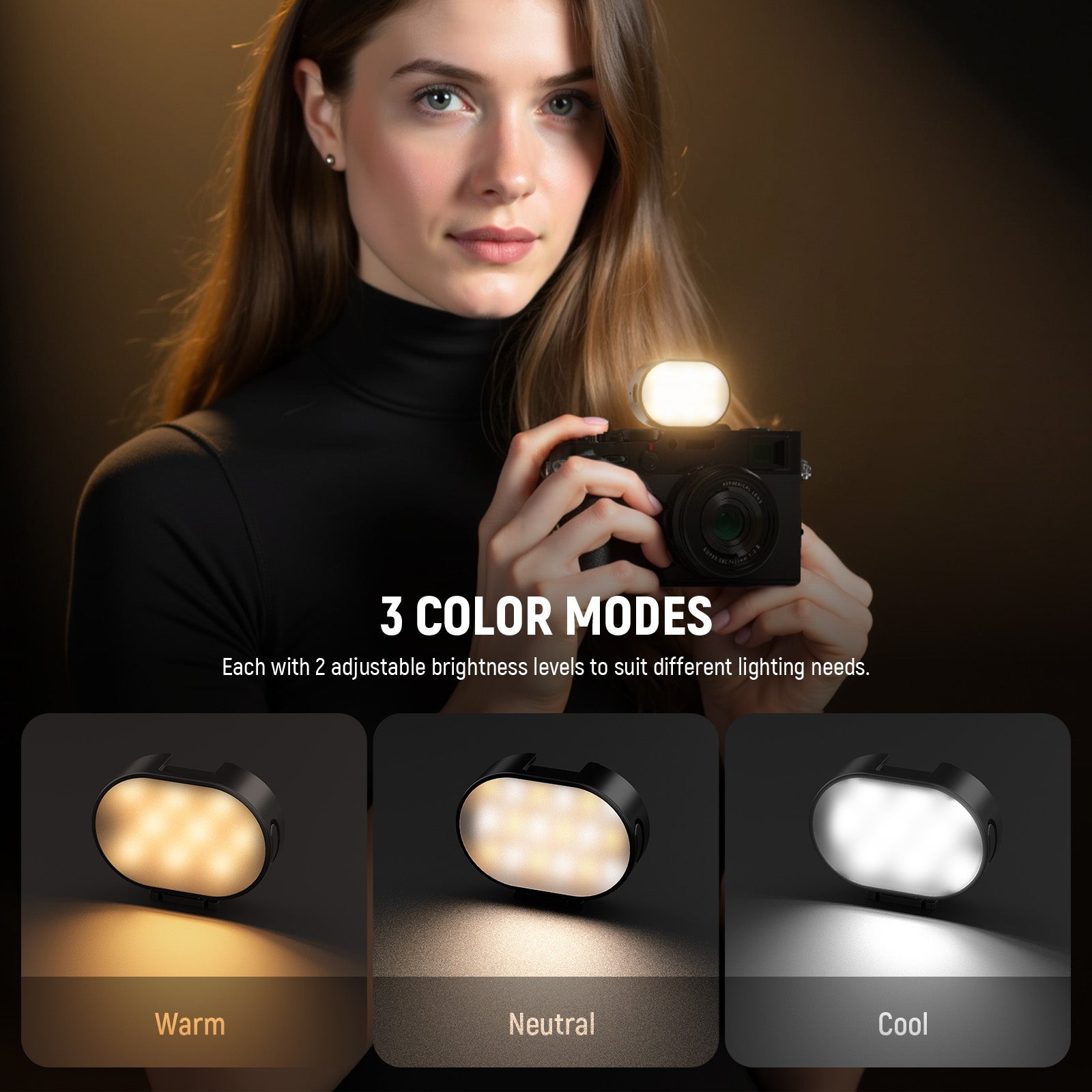 - 3 Color Modes with Adjustable Brightness- This mini camera auxiliary cube light with 9 warm & 9 cool high performance LEDs offers 3 color temperature modes (warm, neutral, cool), each with 2 adjustable brightness levels to suit different lighting needs. With high CRI95+/TLCI98+, it ensures accurate color reproduction. All settings are controlled via a single button for quick adjustment without hassle