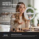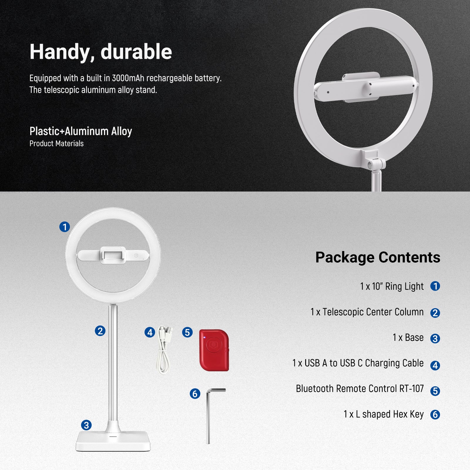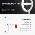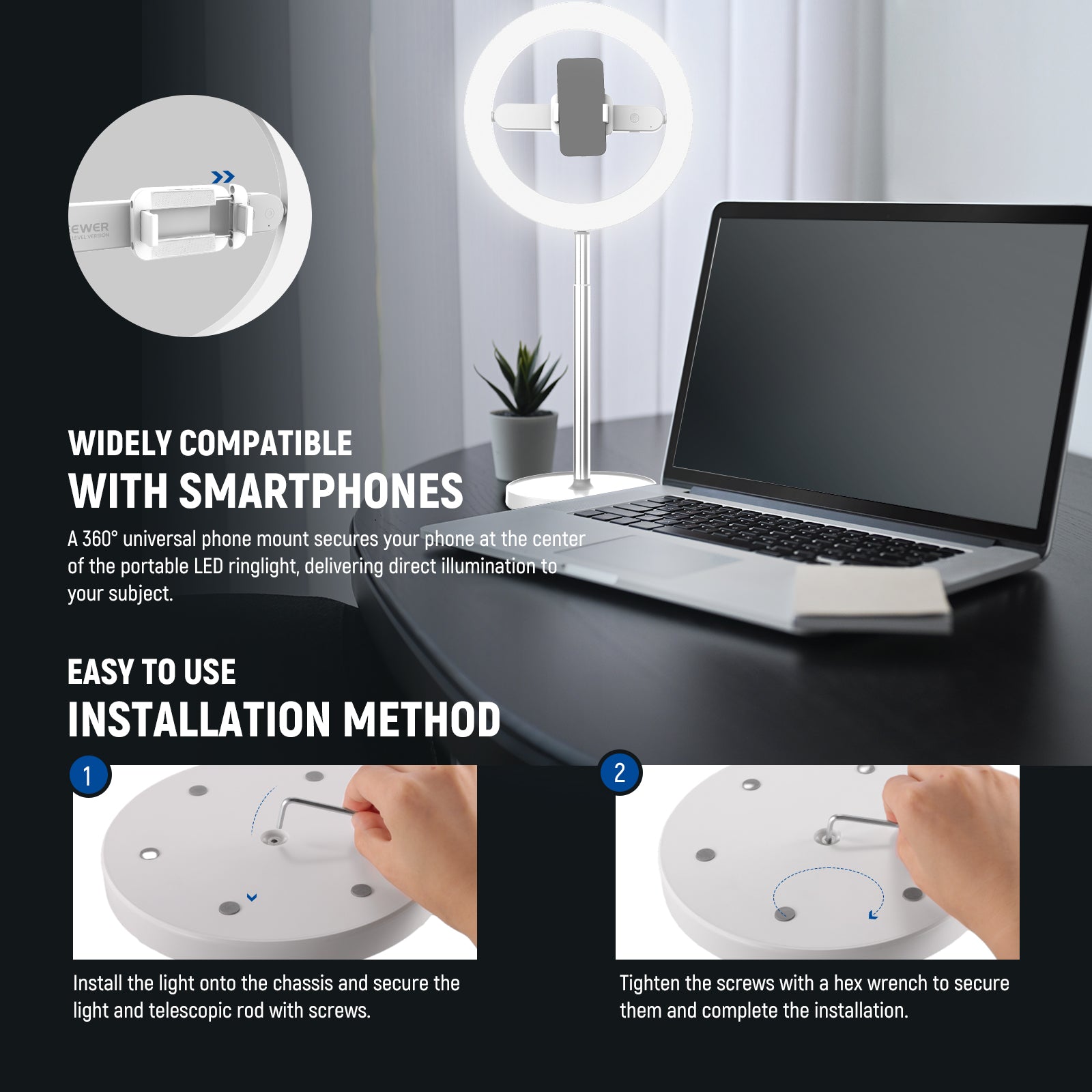 - Telescopic Desk Stand & 180° Tilt- The table halo selfie ring light includes an adjustable desktop mount, providing professional lighting height up to 32.3"/82cm for flexible positioning, ideal for desktop Zoom meetings call/video conferencing on laptop/computer/monitor/webcam. The light head tilts 180° backwards, enabling upward lighting from a lower angle