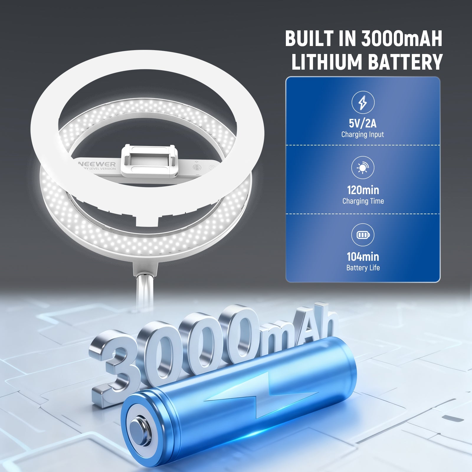 - Built in 3000mAh Battery & USB Powered- With a built in 3000mAh rechargeable battery, the selfie light offers up to 104 minutes of runtime at 100% brightness. It also supports direct 5V/2A or 5V/1A USB power input to provide continuous lighting for uninterrupted shooting. NOTE: For optimal battery longevity, please fully charge the device before first use