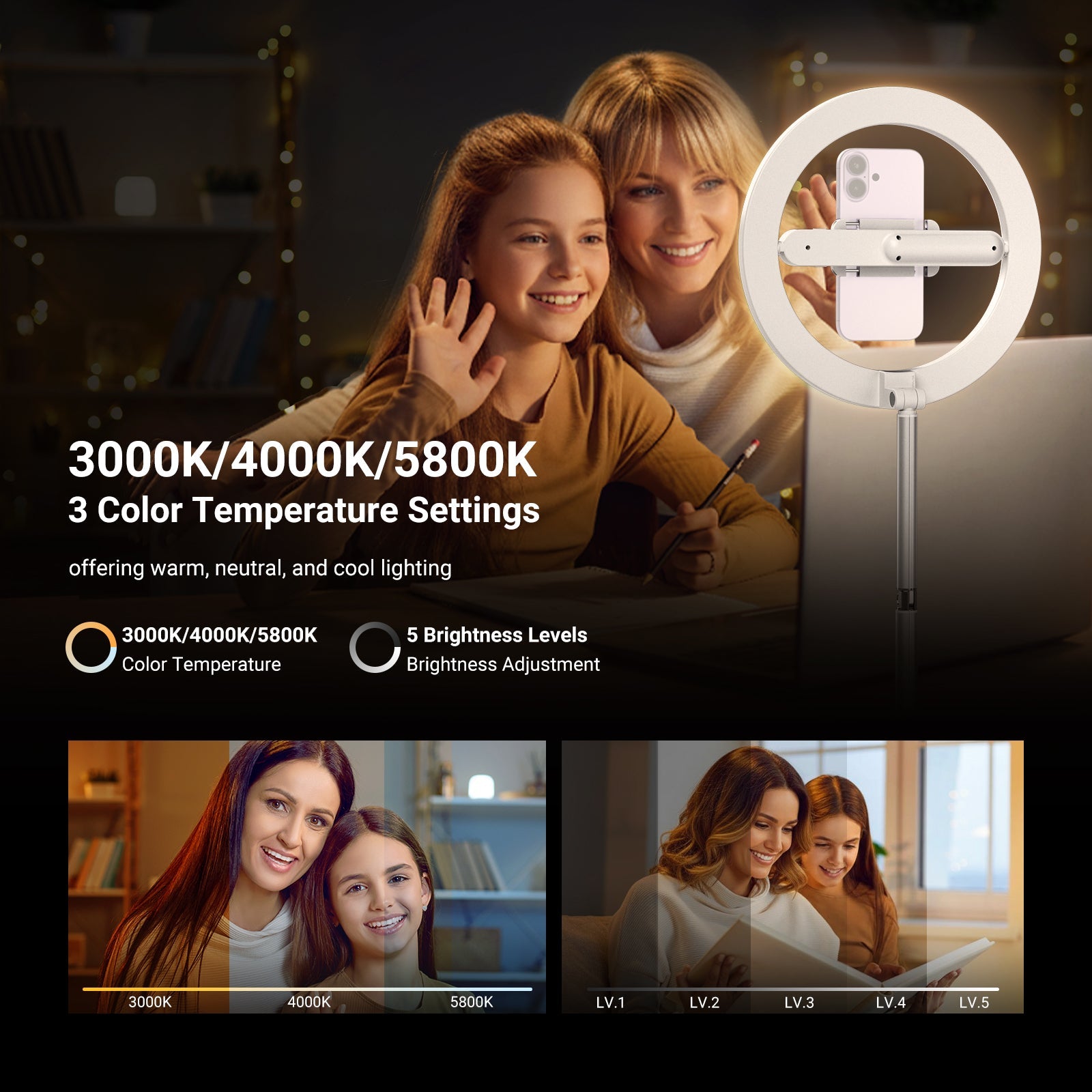 - 3 Color Modes with 5 Brightness Levels- With 144 warm & cool LEDs, this small LED circle ring light delivers up to 830lux/0.5m with CRI85+, offering warm, neutral, and cool lighting with 5 brightness levels to flatter various skin tones. Circular design for soft, even glow to enhance eye sparkle and reduce harsh shadows, as key/fill light for YouTube films TikTok social media vlog, makeup artist video recording, videography podcast, streamer live streaming, selfies, etc
