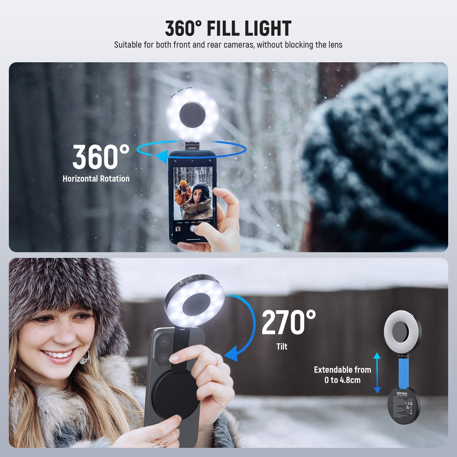 • Portable Mini Ring Light for Phone- The NL40R LED fill light for cell phone photography and video calls is compact at 2.64"x2.64"x0.89"/67x67x22.5mm when folded, weighing only 2.47oz/70g. It easily fits in a pocket, making it an ideal accessory for on the go shots. It features 40 premium warm & cool LEDs that provide 914lux/0.2 illuminance with a high CRI of 95+, ideal as phone selfie lighting to enhance your complexion and minimize facial blemishes to make you look your best on camera
