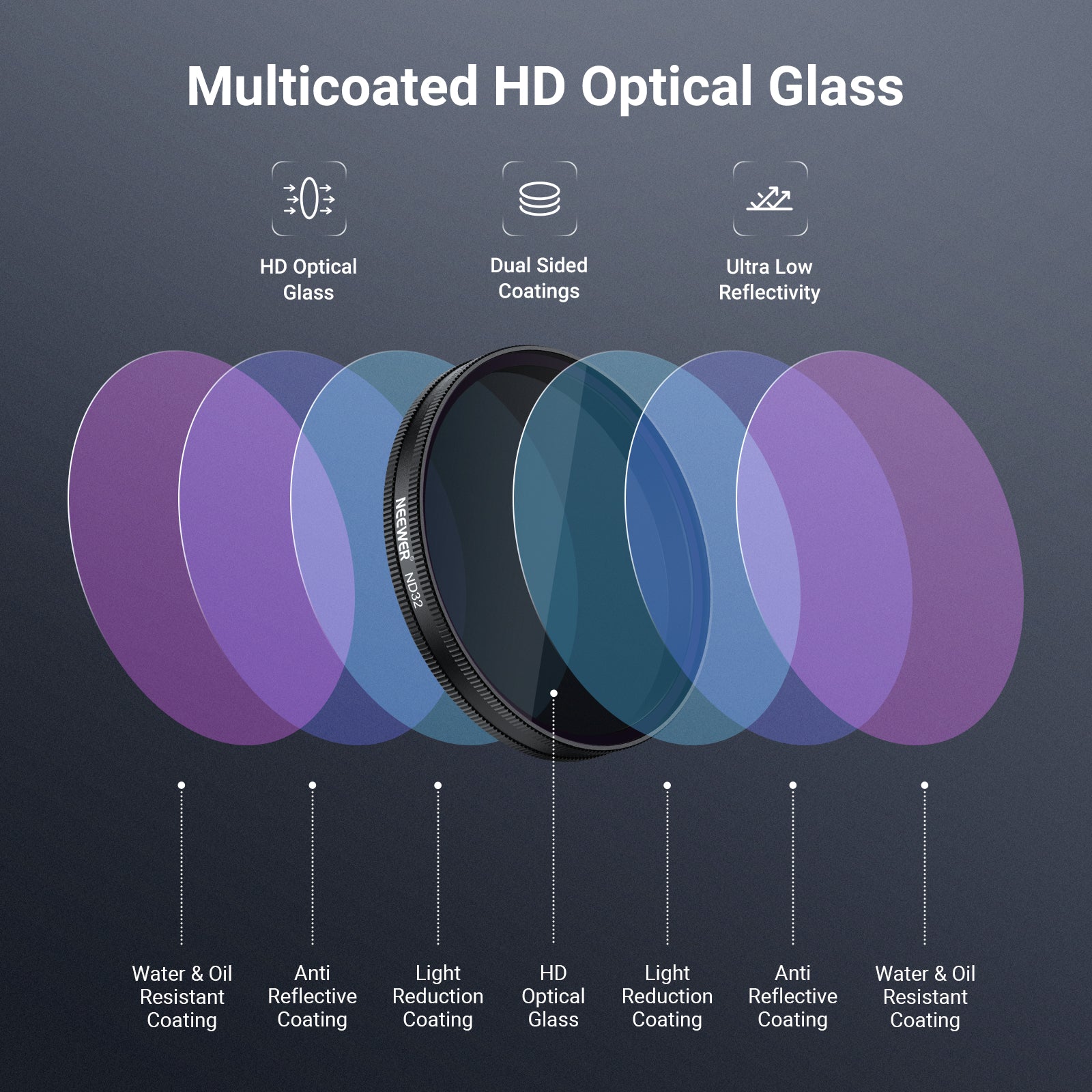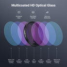 - Vidrio óptico HD multicapa : El vidrio óptico HD garantiza una claridad de imagen excepcional. Múltiples capas protectoras en ambas caras resisten al agua, arañazos y huellas dactilares.