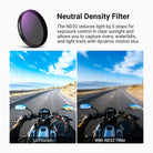 - Control de exposición flexible : los filtros de densidad neutra ND8, ND16 y ND32 proporcionan 3, 4 y 5 pasos de reducción de luz, lo que permite una exposición equilibrada en diversos entornos y efectos creativos de desenfoque de movimiento.