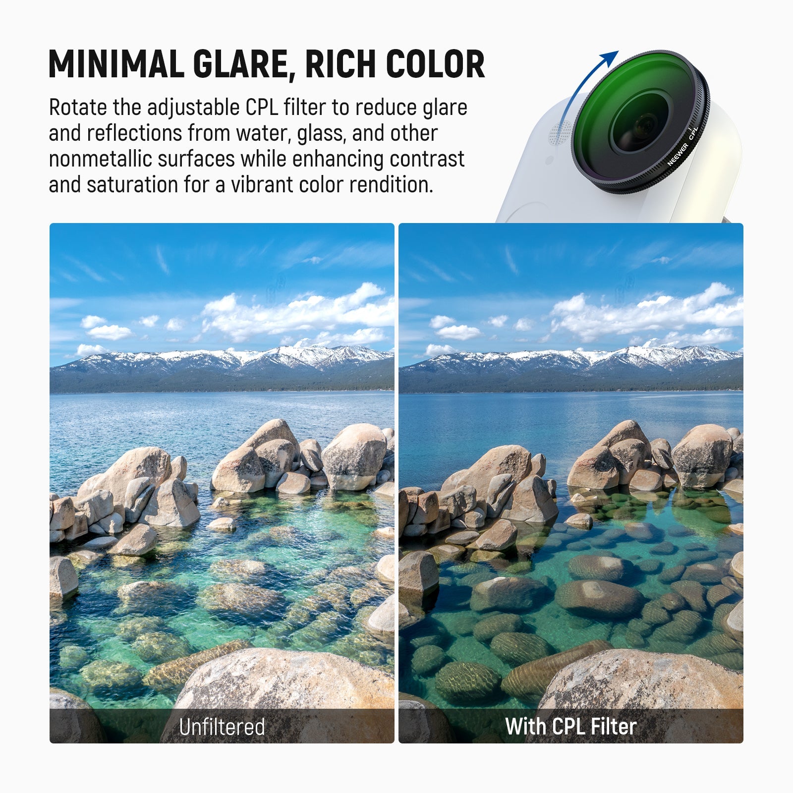 - Minimal Glare, Rich Color- Rotate the adjustable CPL filter to reduce glare and reflections from water, glass, and other nonmetallic surfaces while enhancing contrast and saturation for a vibrant color rendition