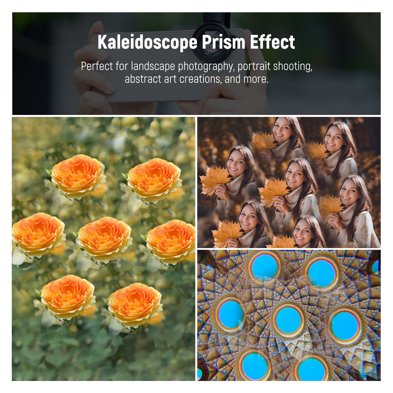 • Creative Kaleidoscopic Effect- The kaleidoscope prism lens filter bends and refracts light to create duplicated and circular elements in the camera. By changing angles, it also scatters light and creates a hypnotic and surreal kaleidoscopic effect